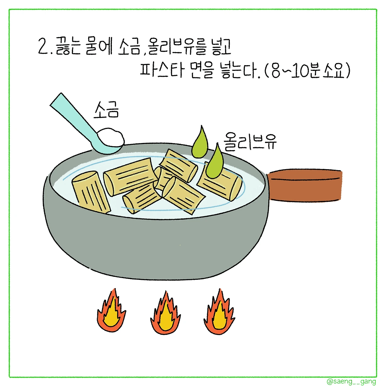 2. 끓는 물에 소금과 올리브유를 넣고 면을 삶아요 (8~10분 소요)