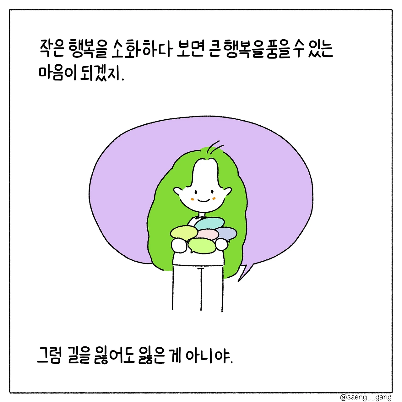 그러면 길을 잃어도 잃은 게 아냐. 행복을 발견하는 근육을 키우는 거지. 소망을 하나둘 이루면 그건 행복이 되는 거야.
