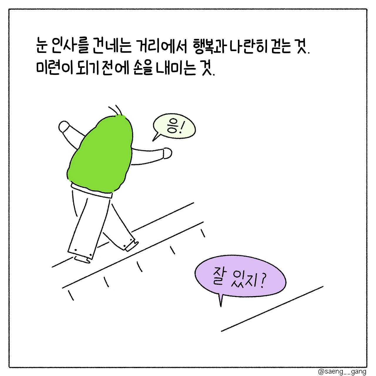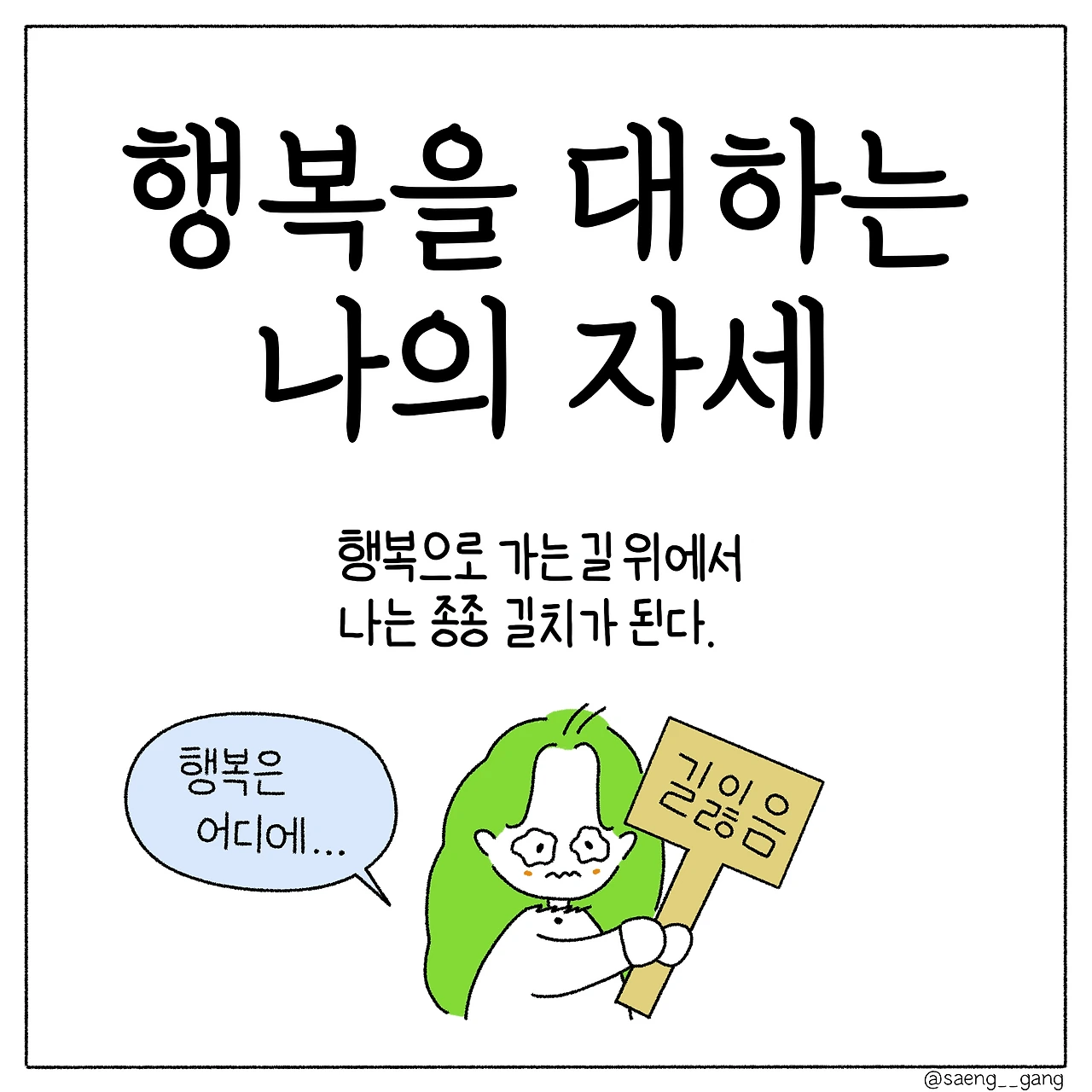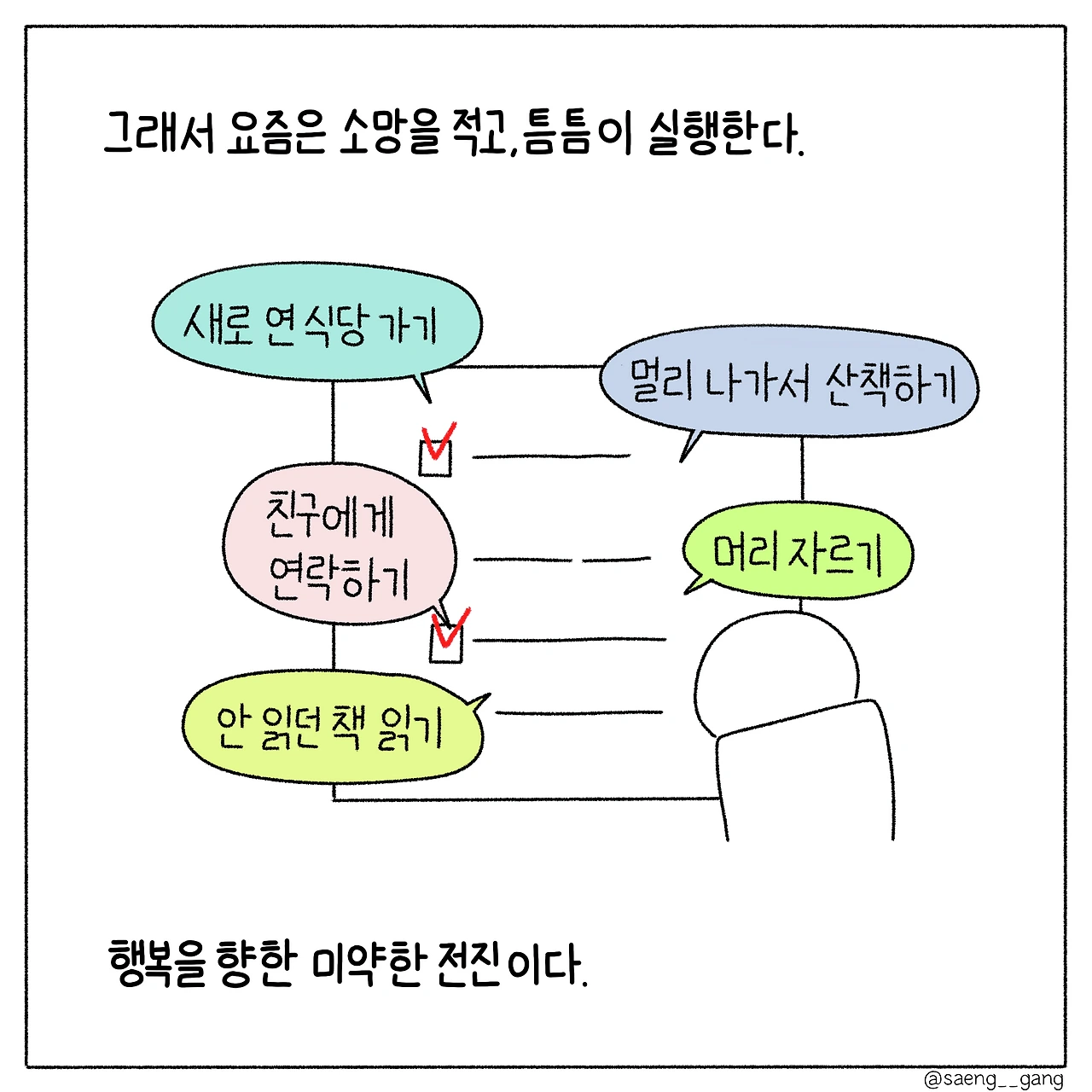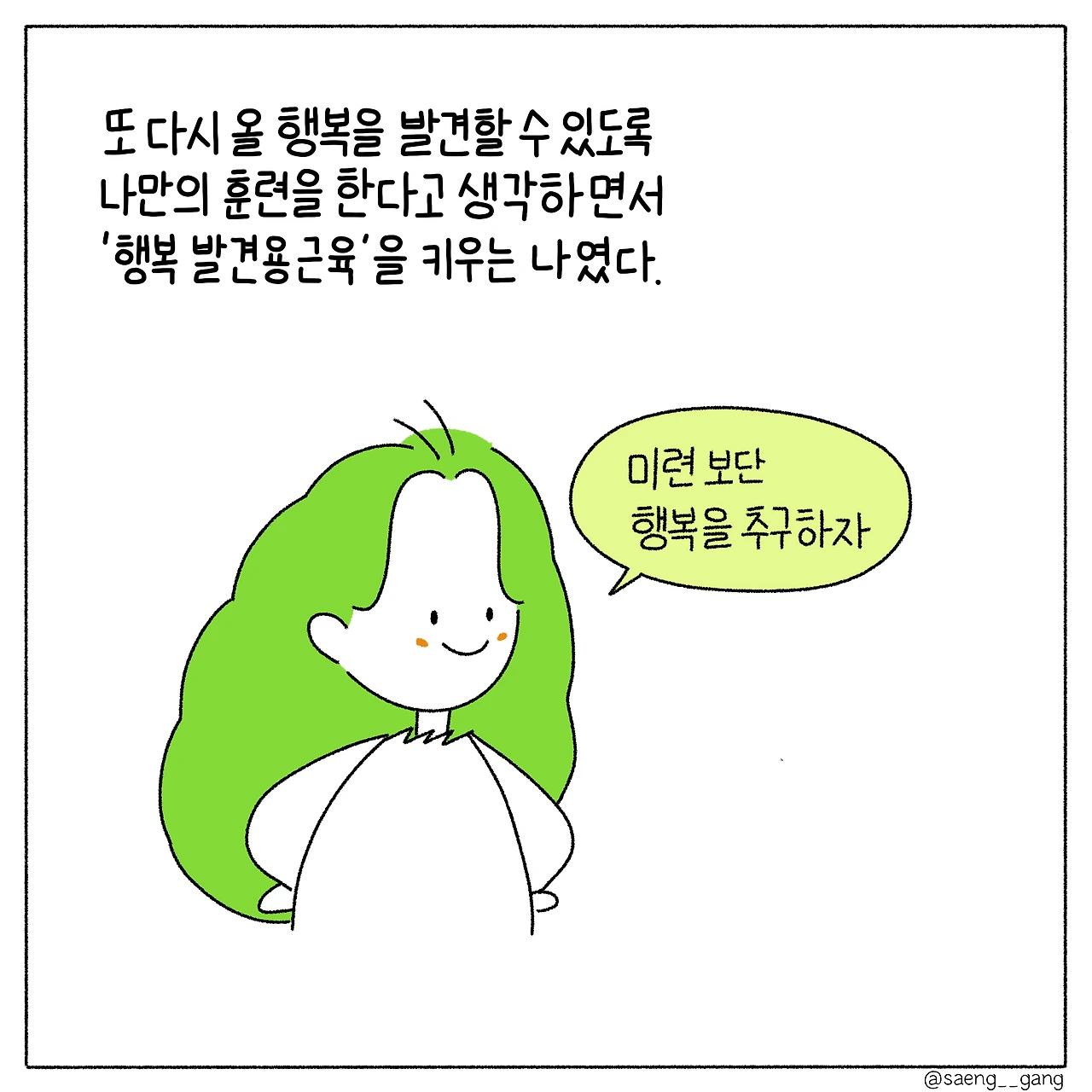 여전히 나는 행복이 어렵다. 다만 눈짓으로 서로를 알아볼 정도의 거리에서 서로가 녹슬지는 않는지 확인하며, 미련이나 억울함이 되지 않도록 보듬고, 지금 할 수 있는 소망을 해내며 작은 행복에 가까워지고 그리하여 마음이 행복으로 가득 찼을 때, 더 큰 행복을 품을 수 있는 크기의 마음이 될 것이라 상상한다.