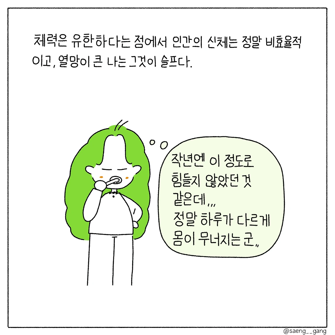 어릴 땐 이 말을 깊이 이해하지 못했는데, 해가 갈수록 말 그대로 뼈저리게 느끼고 있다. 체력이 고갈되는 것은 이런 거구나, 싶어 일찍 잠에 들기를 시도하고 일찍 눈을 뜬다. 건강한 삶이 기본이었던 날을 다시 되찾을 수 있을까.