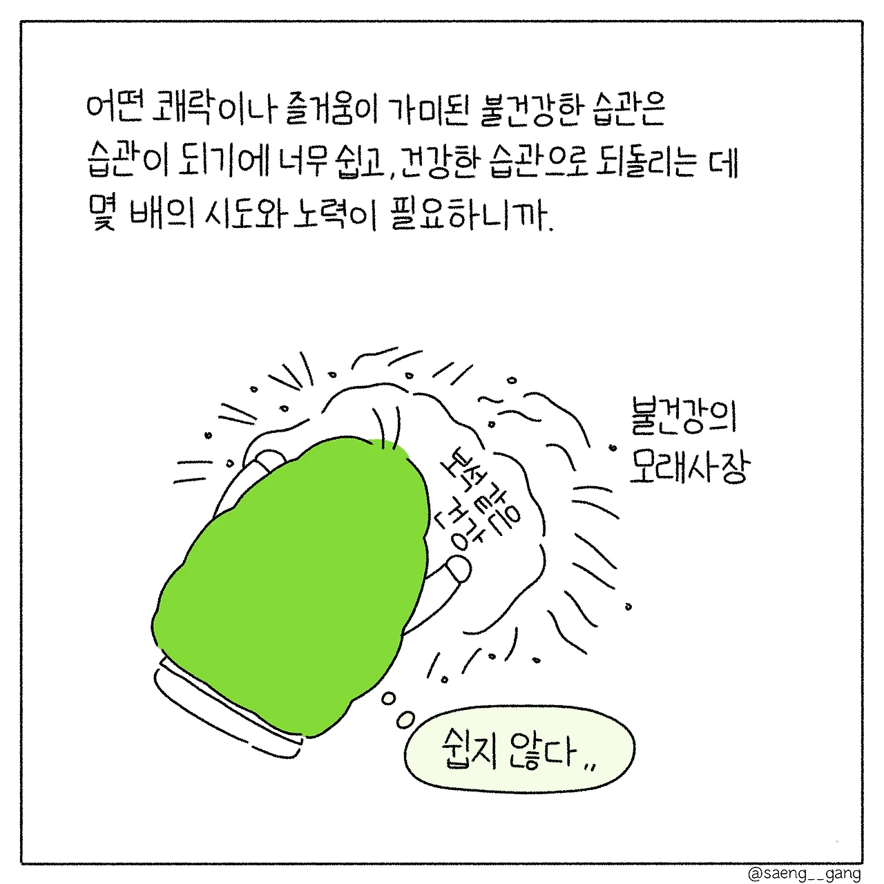 불건강한 습관에는 쾌락이나 즐거움이 묻어있어 그대로 습관이 되기에 쉽다. 바르고 건강한 습관은 계속 파내야 하는 보석 같기도, 무너지지 않도록 오랫동안 지켜보아야 하는 모래성 같기도 하다.