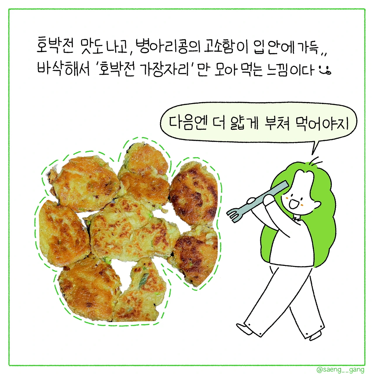 애호박과 대파를 넣어, 호박전과 비슷한 맛을 흉내 냈고, 전을 먹을 때마다 오로지 맛있는 부분만 먹던 어느 날의 소망을 실현하기 위해 병아리콩 반죽을 최대한 얇게 눌러 부쳤다.