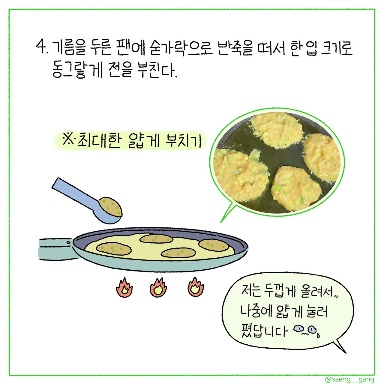 4. 팬에 기름을 두르고 숟가락으로 반죽을 떠서 한 입 크기로 전을 부친다. (최대한 얇게 하는 게 중요!)