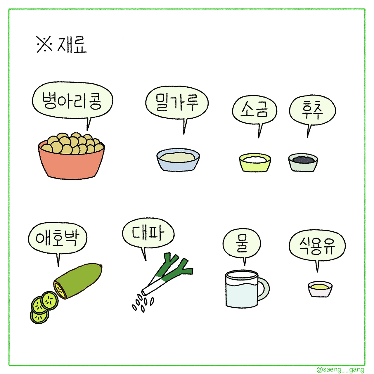 병아리콩 / 밀가루 / 애호박 / 대파 / 소금 / 후추 / 물/ 식용유