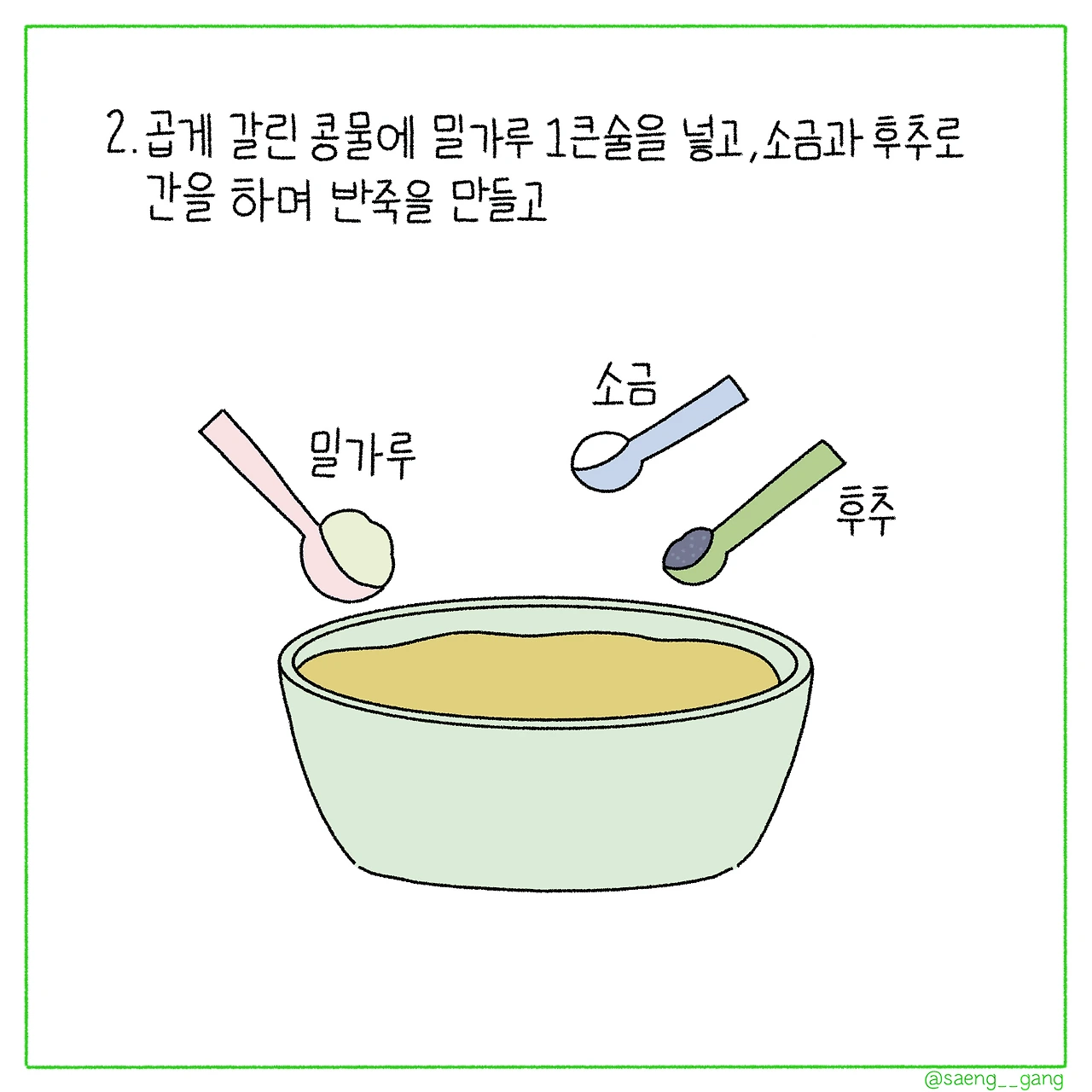 2. 콩물에 밀가루 1 큰술 넣고, 소금과 후추로 간을 하며 반죽을 만든다.