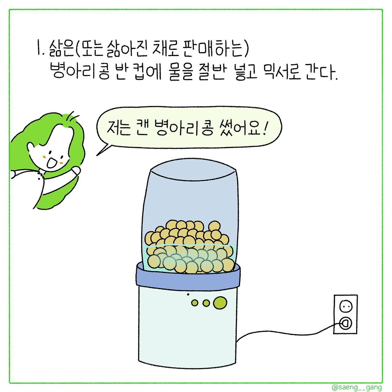 1. 삶은 병아리콩 반 컵에 물을 절반 넣어 믹서로 갈아준다 (믹서기도 좋고, 핸드 믹서도 좋아요)