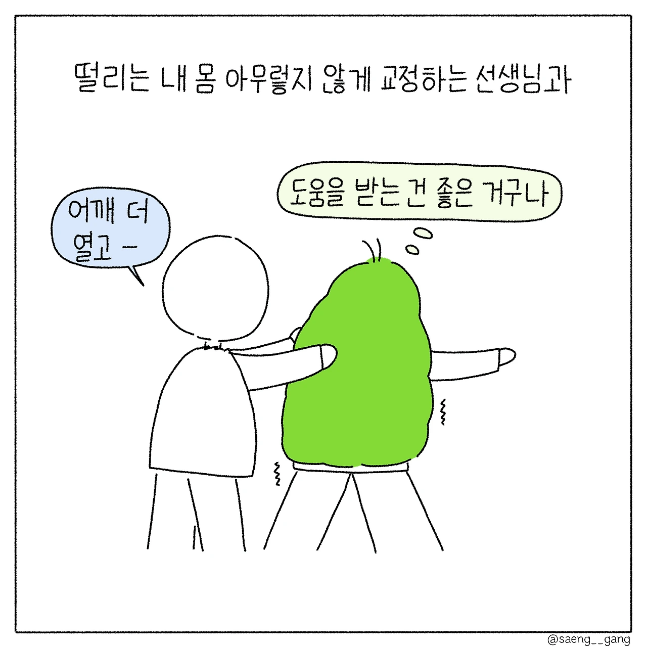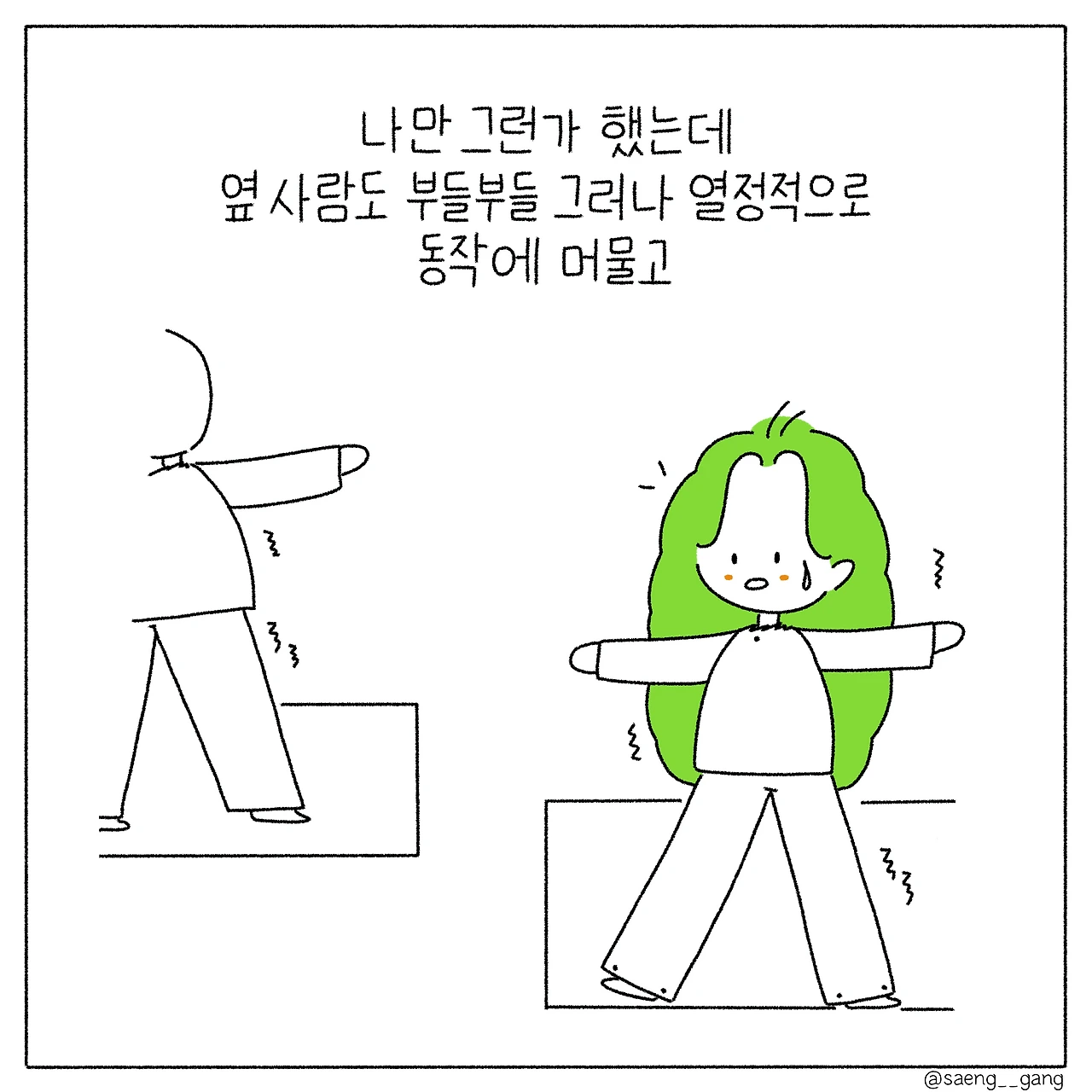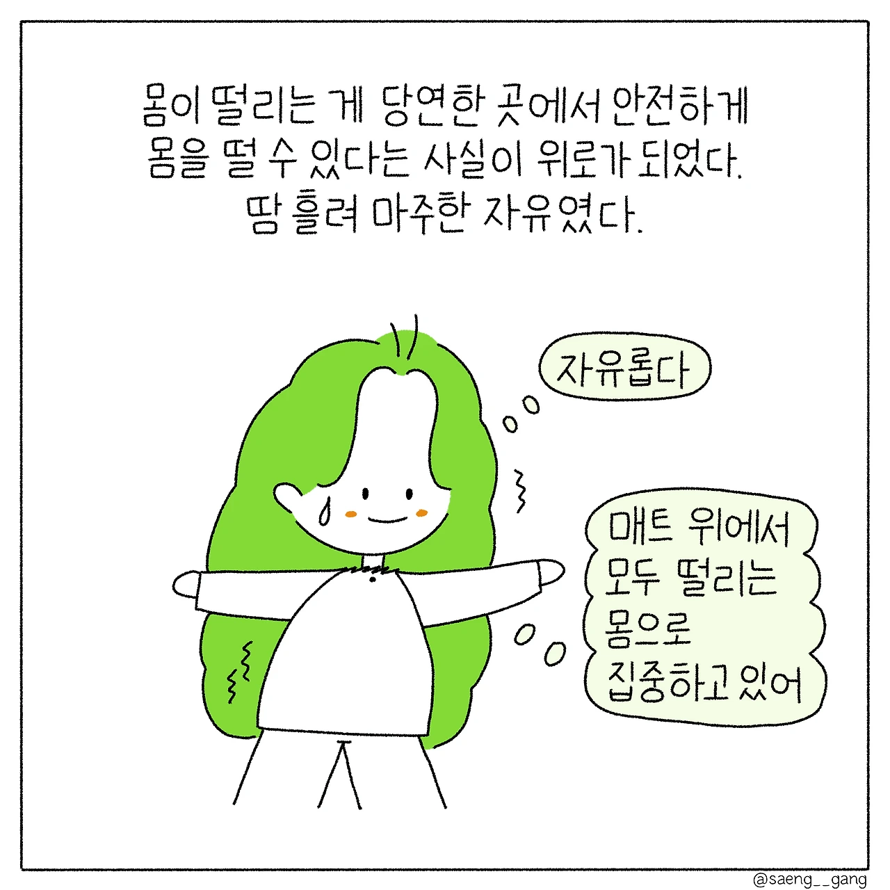 나만 그런가 했더니 수련하는 모든 이의 몸이 떨렸다. 고개를 돌려 반대편으로도 같은 동작을 하는데 옆 사람의 몸도 나처럼 떨리고 있었다. 이곳은 몸의 진동이 허락된, 자연스러운 곳이구나. 그 생각을 하니 몸이 떨리는 것이 민망하지 않았다.