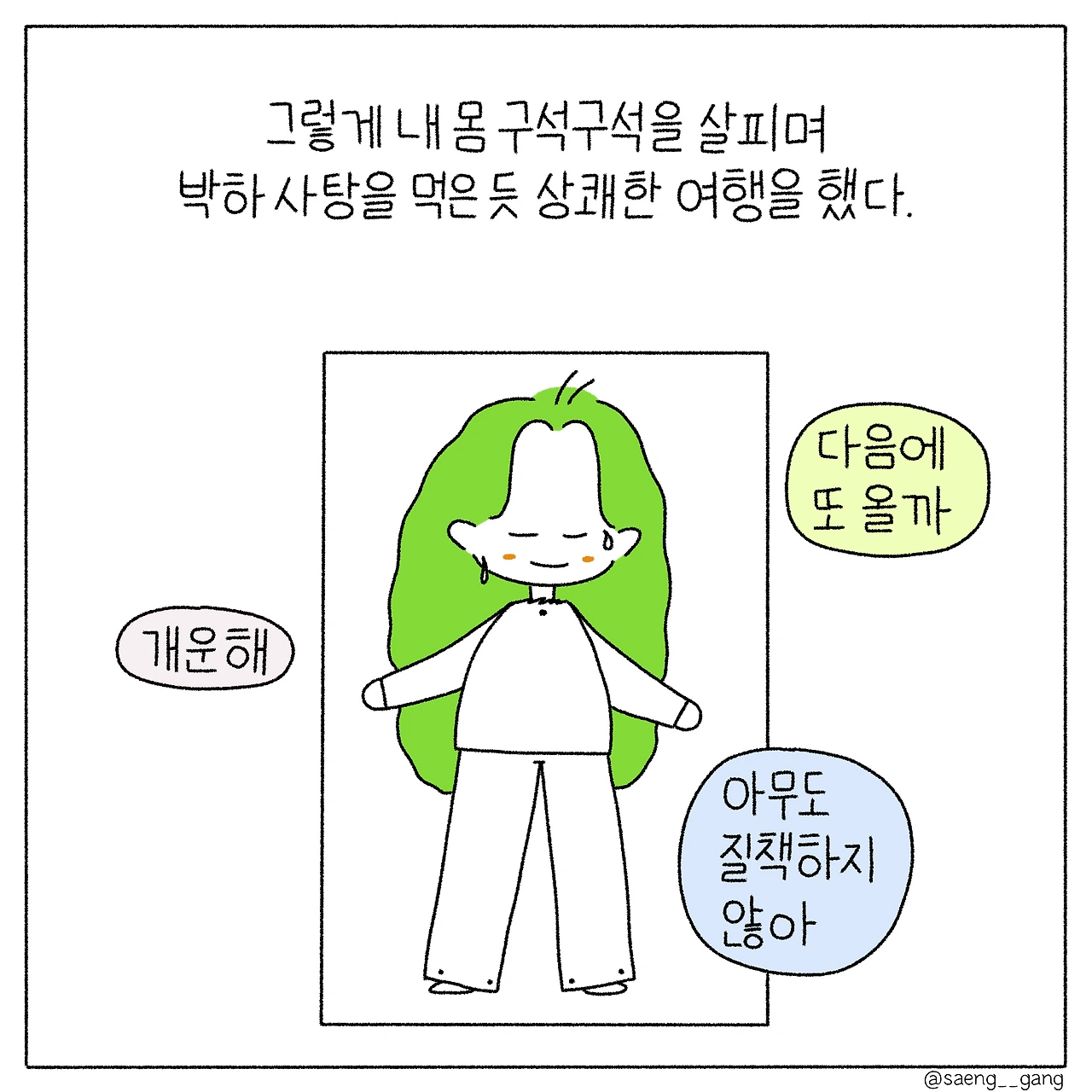 평온하게 자세를 잡아주는 선생님, 매트 위에 손과 발이 스치는 소리, 호흡하는 소리. 땀 흘려 마주한 자유는 어딘가 자연과 닮아있었다. 그대로 두며 그대로의 나를 받아들이는 것이.