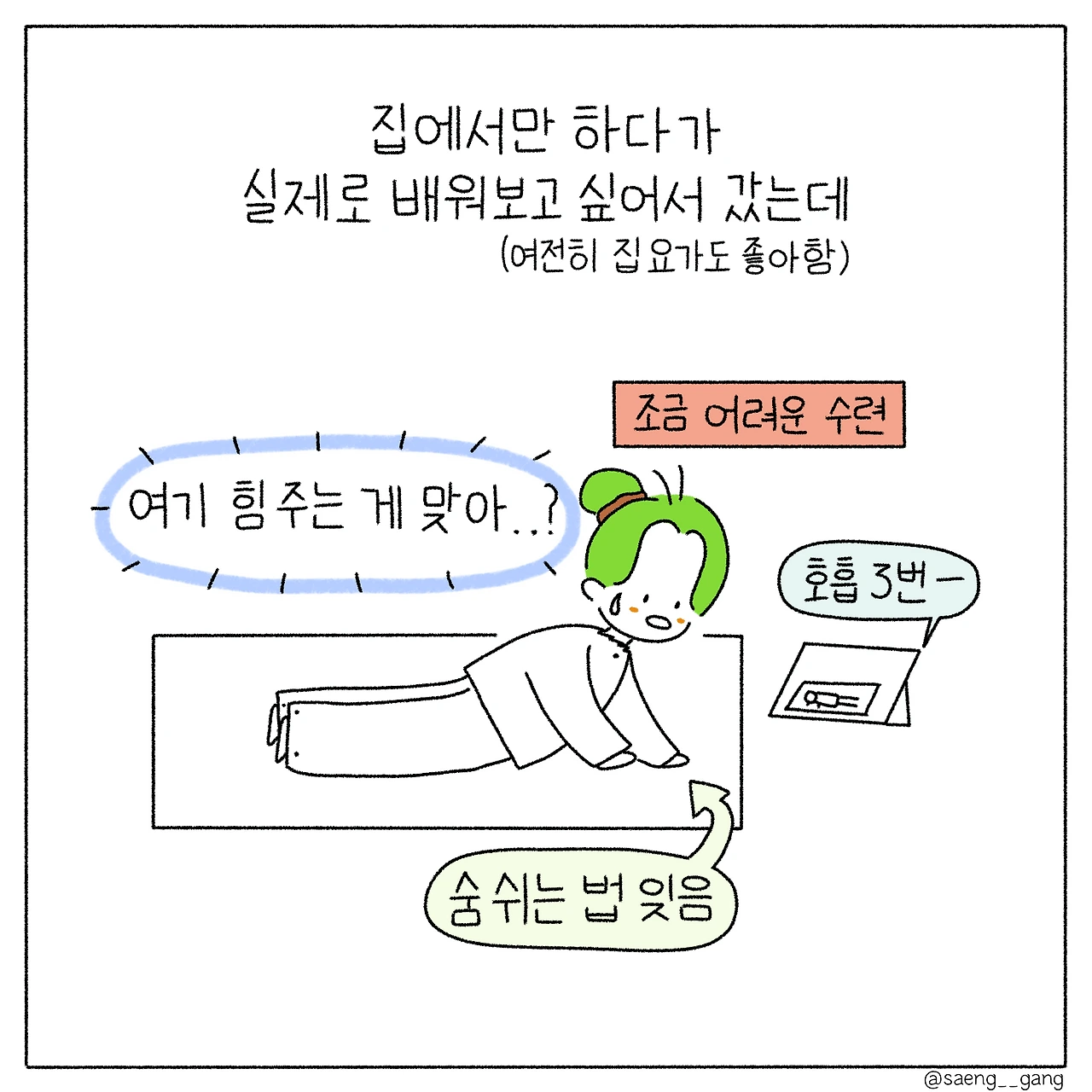 잃어버린 체력을 찾아서 요가를 시작한 지 2년이 됐다. 집에서 영상을 보며 따라 한 것뿐인데도 건강하고 개운해지는 기분에 언젠가 요가원에서도 배워보아야겠다는 생각을 했다. 가르침을 받는 것은 언제나 즐거우니까.