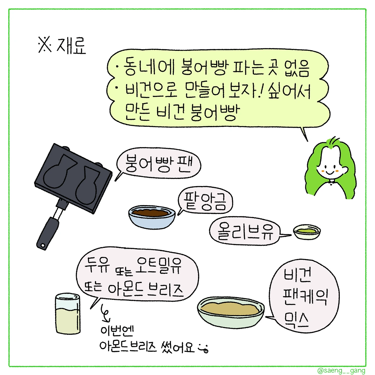 붕어빵 팬 / 비건 팬케익 믹스 / 두유, 오트밀유, 아몬드브리즈 중 1개 / 올리브유 / 팥앙금