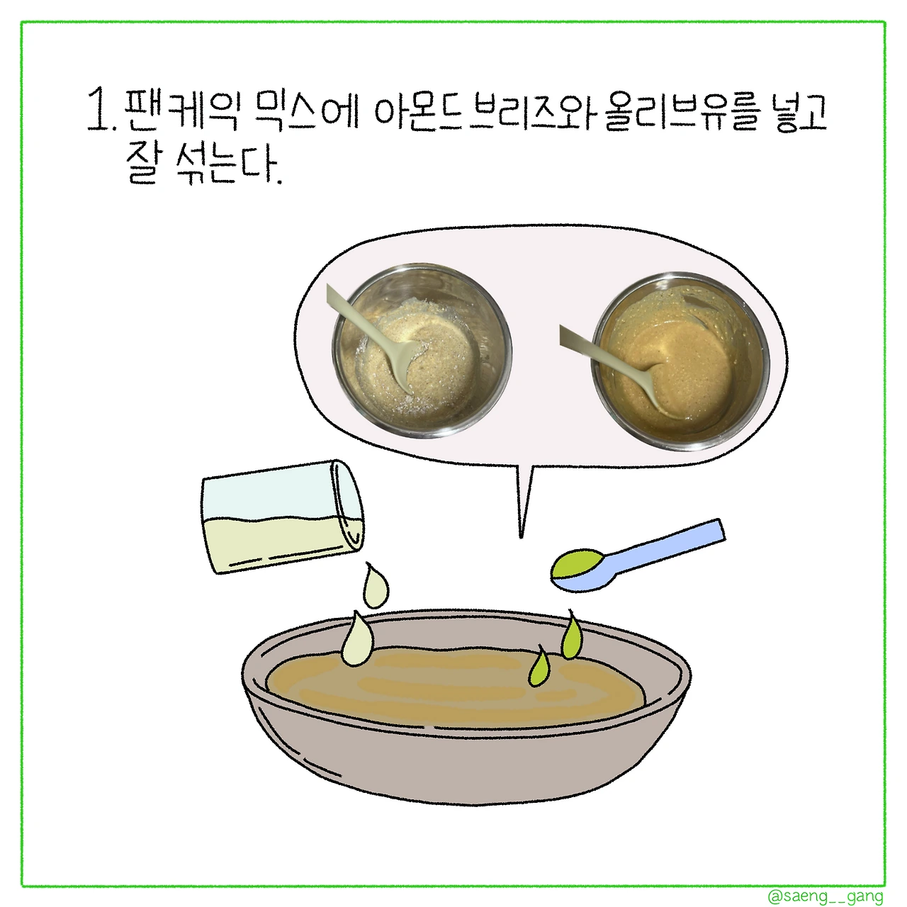 1. 팬케익 믹스에 아몬드 브리즈를 조금씩 부어 섞고, 올리브유는 한 바퀴만 두른다. 그대로 계속 저어준다.