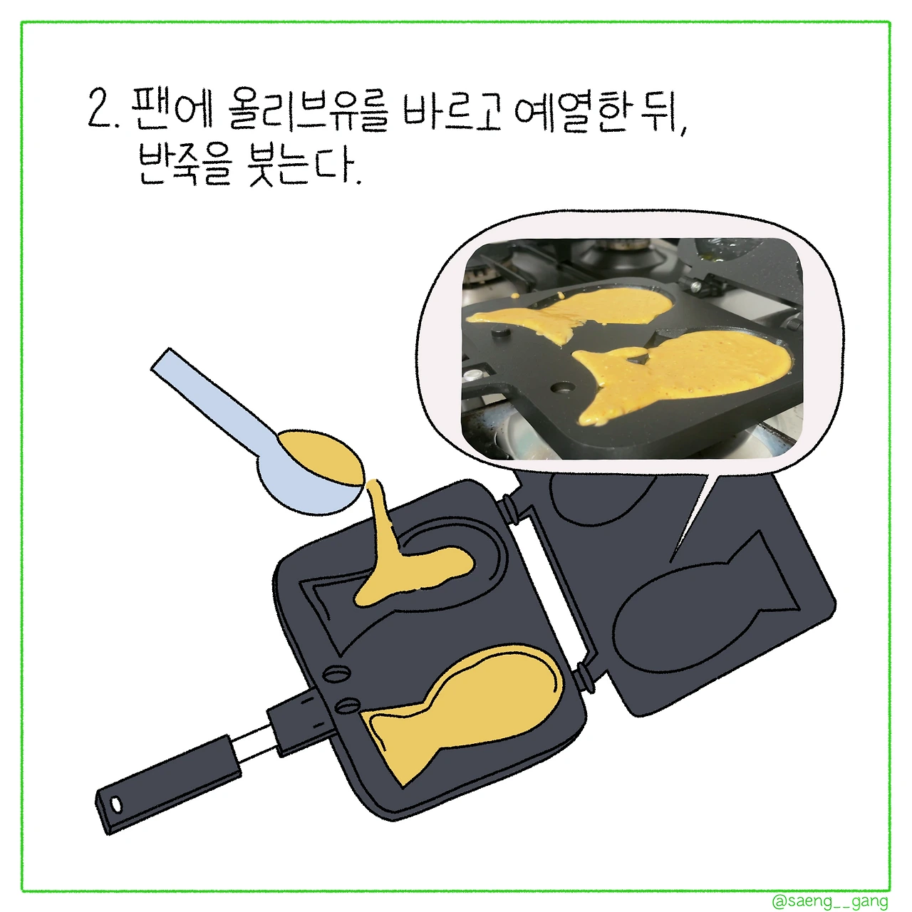 5. 약불에서 중불 사이로 붕어빵을 굽는다. 팬을 수시로 뒤집어서 타지 않게 한다.