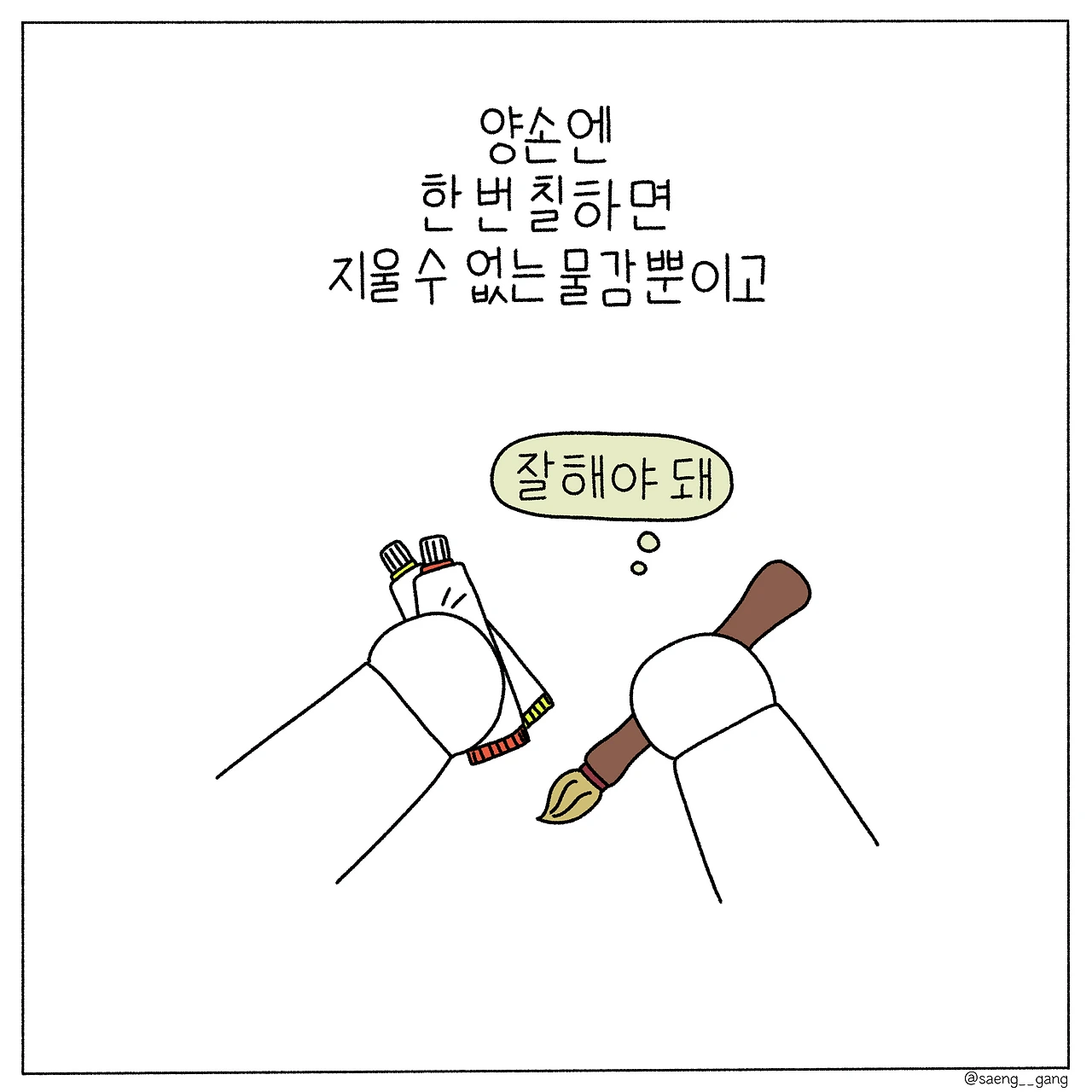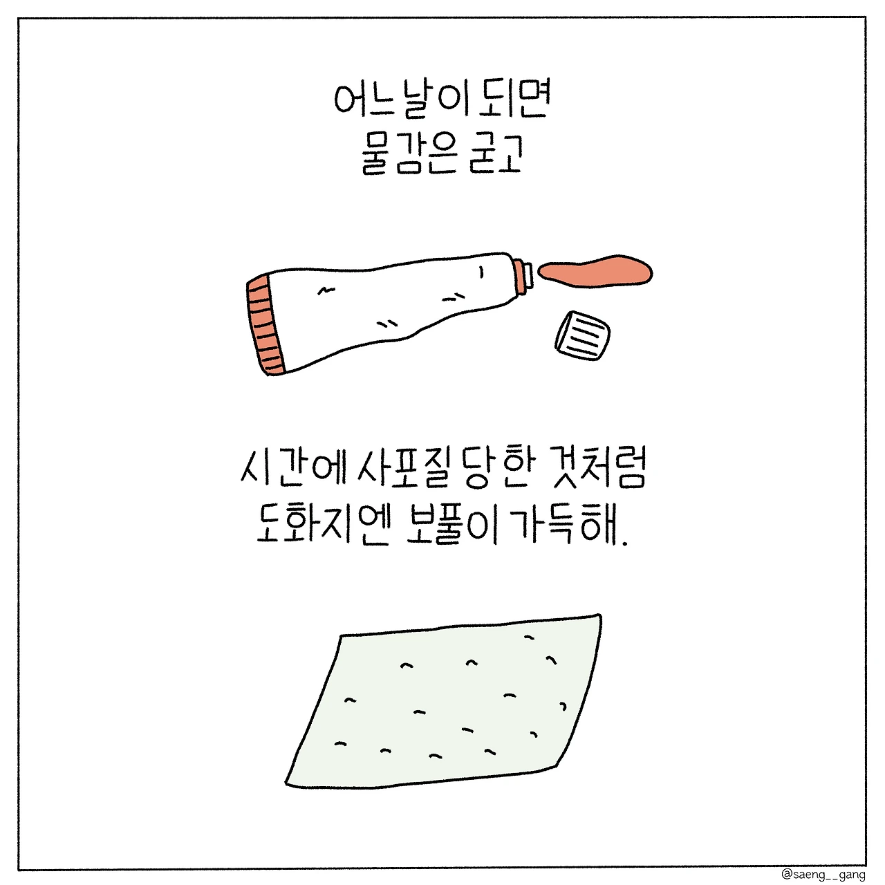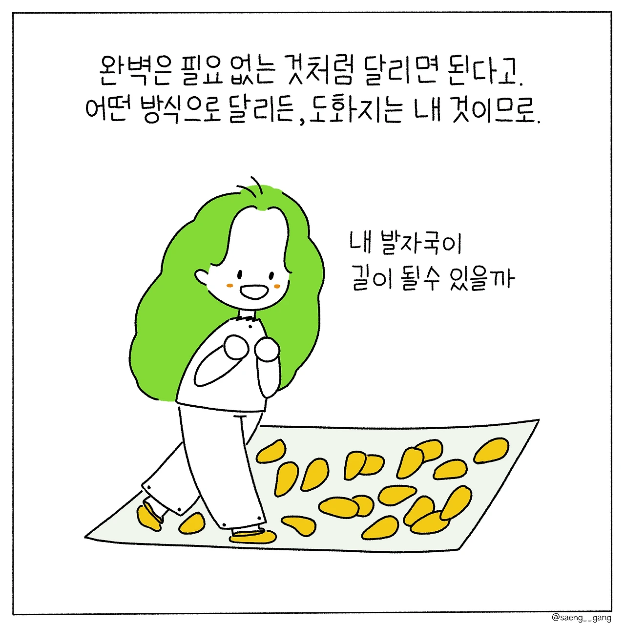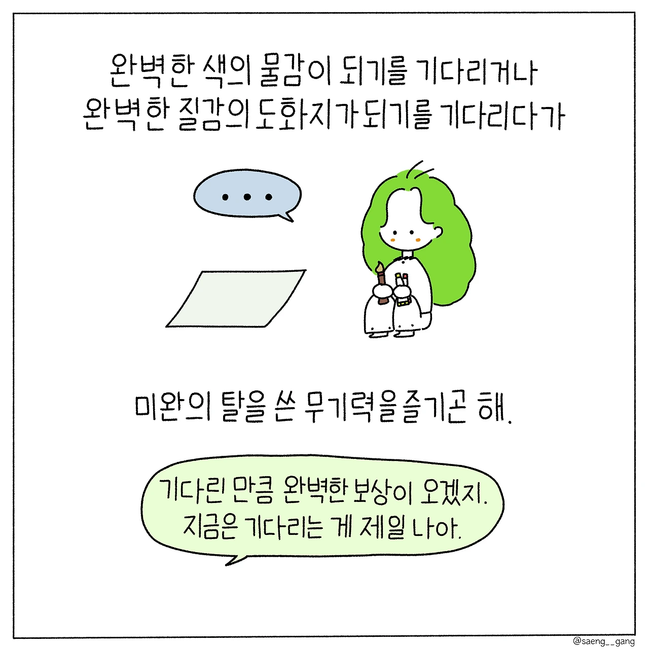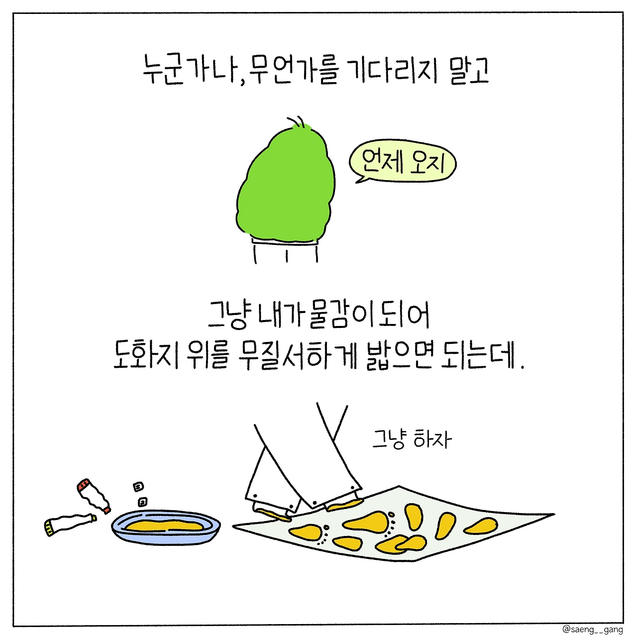 그러니 우리는 각자의 도화지 위를 무질서하게 밟아야 한다. 기다린다고 해서 완벽이 찾아온다는 보장도 없고 기다림이 곧 완벽을 숙성시키는 것도 아니므로. 무질서는 곧 나의 질서가 될 것이라 생각하며 그저 달리면 된다.