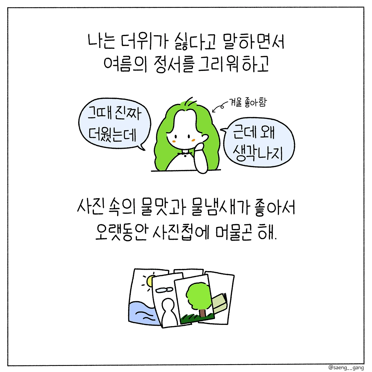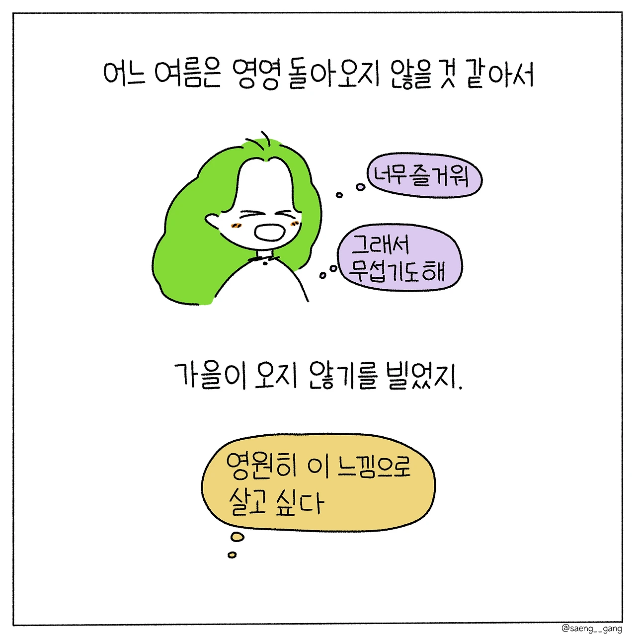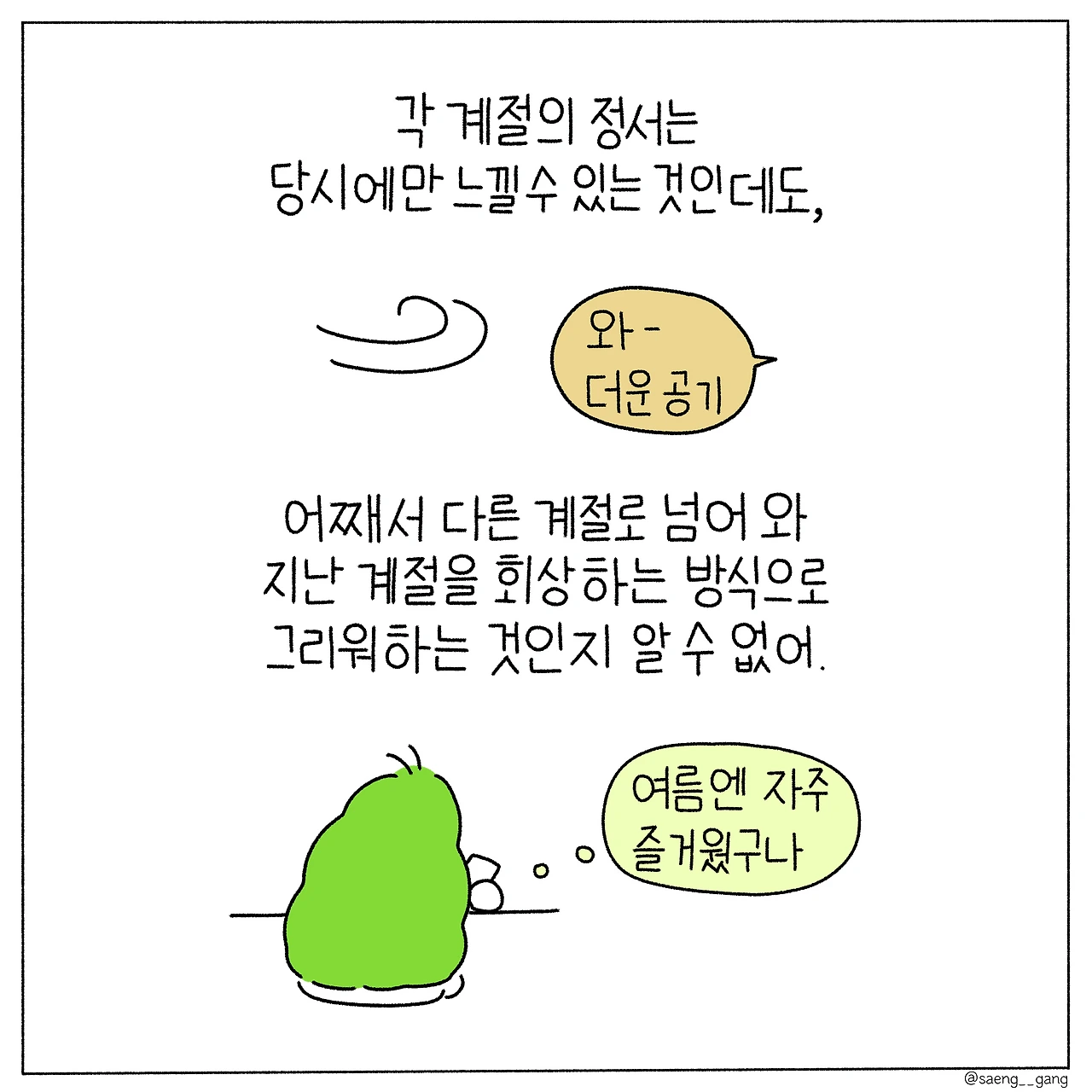 햇빛에 구워진 이파리는 라임색이 되고 해가 늦게 떨어지면 노을은 느리게 재생된다. 나는 겨울을 가장 좋아하지만, 여름의 정서가 좋다.