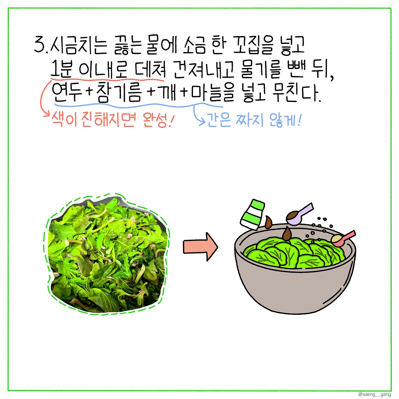 3. 시금치는 소금을 넣은 물에 1분 이내로 데친 뒤 물기를 제거하고, 참기름+깨+연두+다진 마늘을 넣고 버무린다.