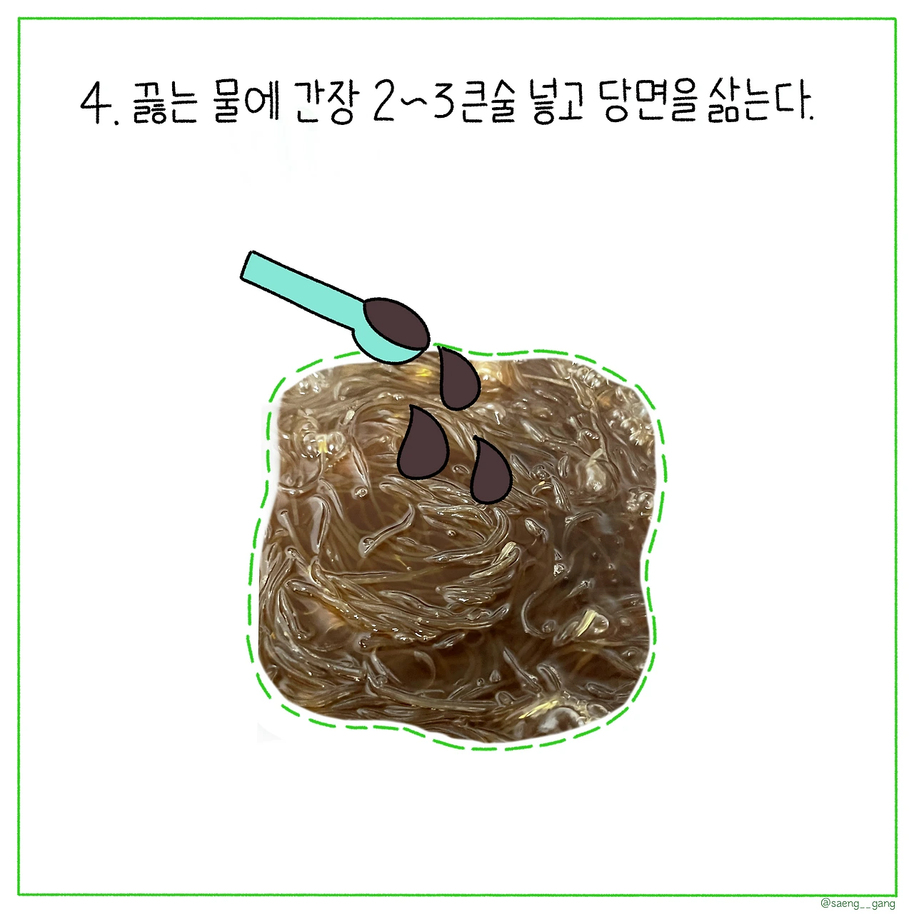 4. 당면이 다 불으면 끓는 물에 간장 2~3 큰술을 넣고 당면을 삶아준다.