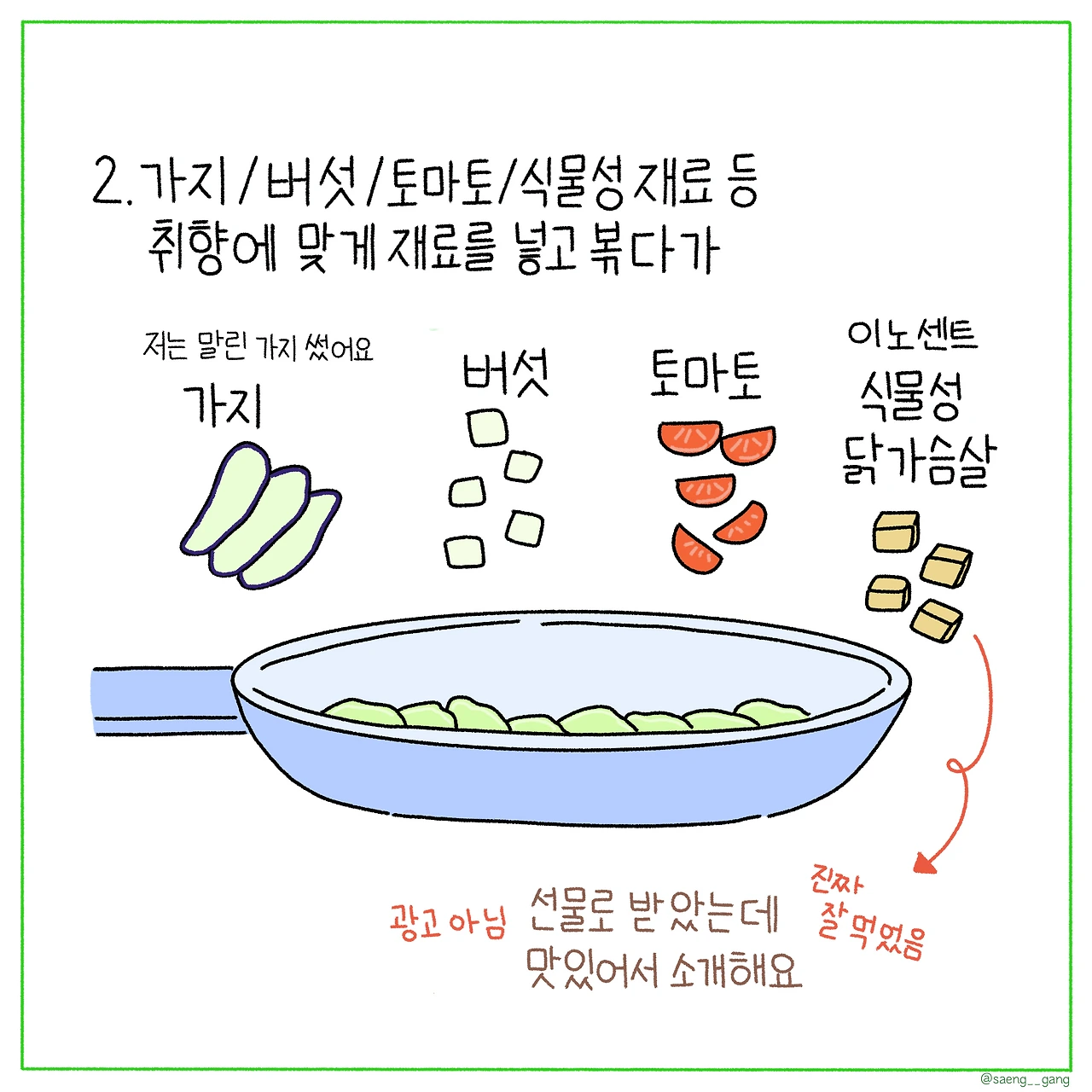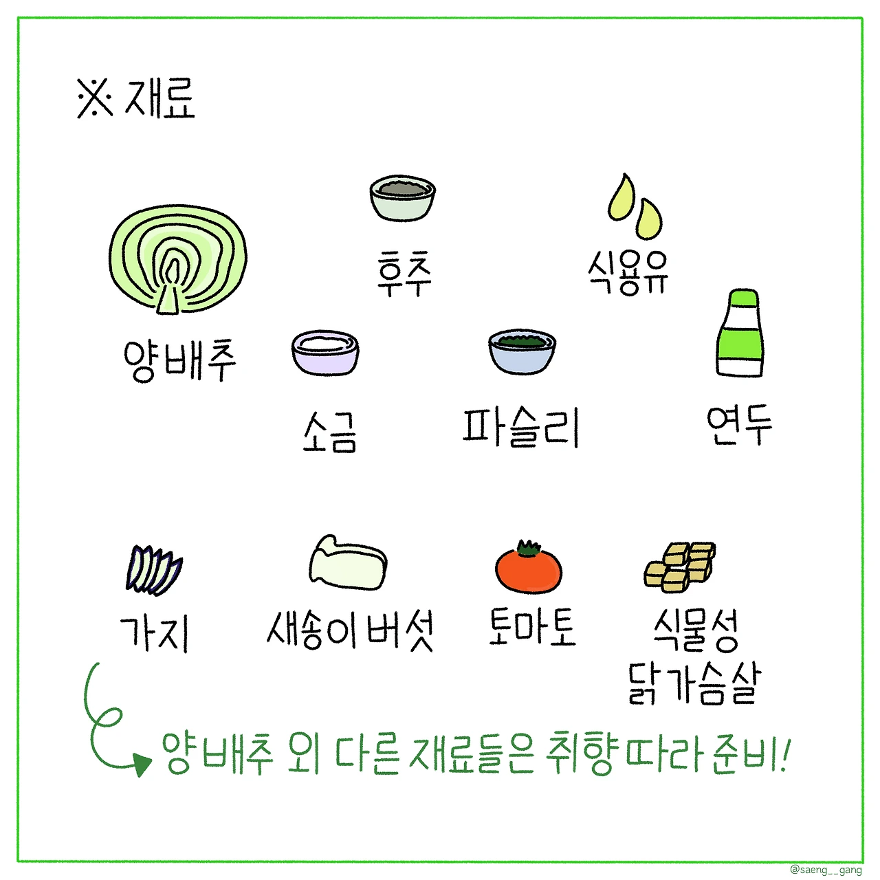 가지 / 새송이 버섯/ 토마토 / 식물성 닭가슴살 (이 재료들은 취향에 맞게 준비!)