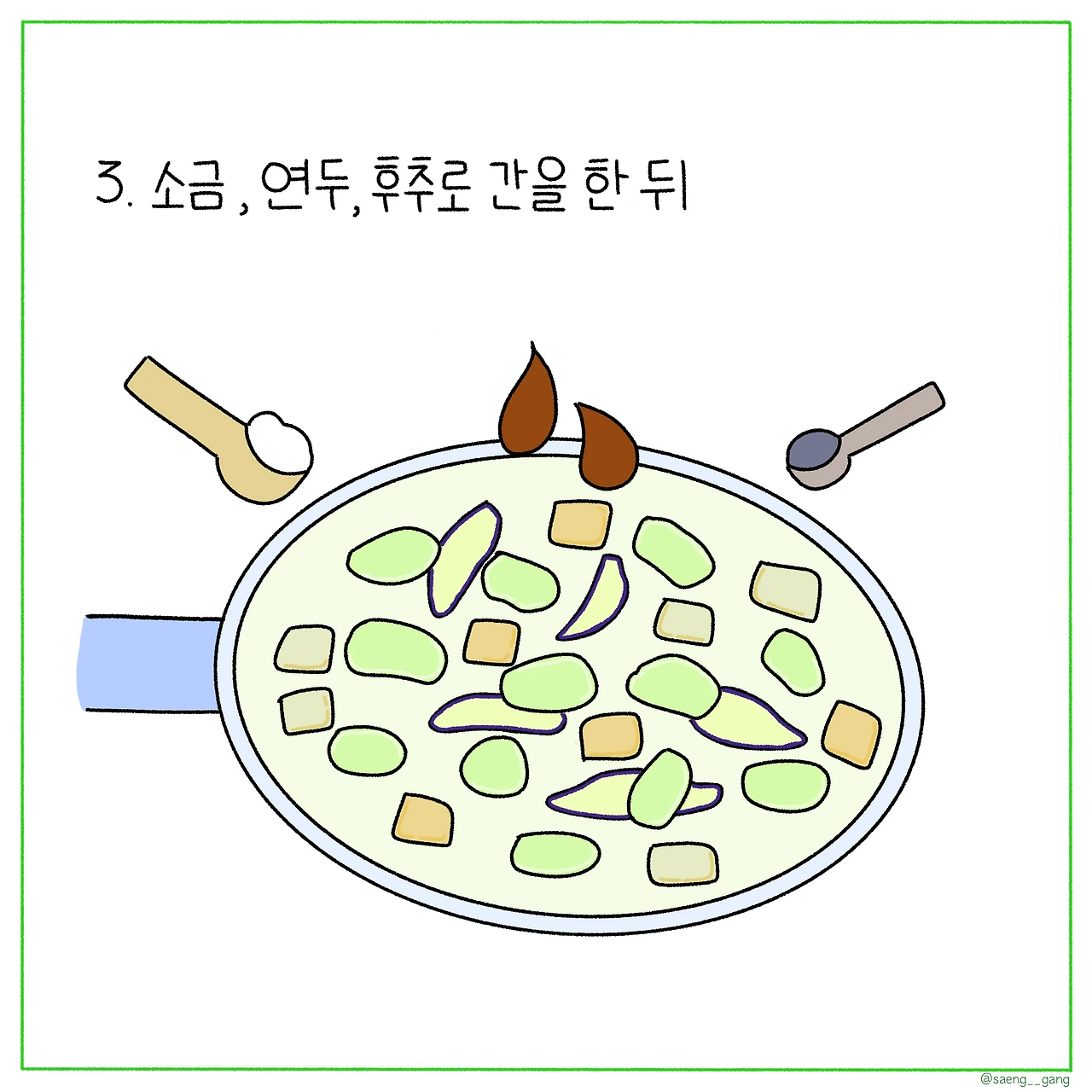 3. 소금, 후추, 연두로 간을 하고 (소금 또는 연두만 써도 괜찮아 요) 계속 볶는다.