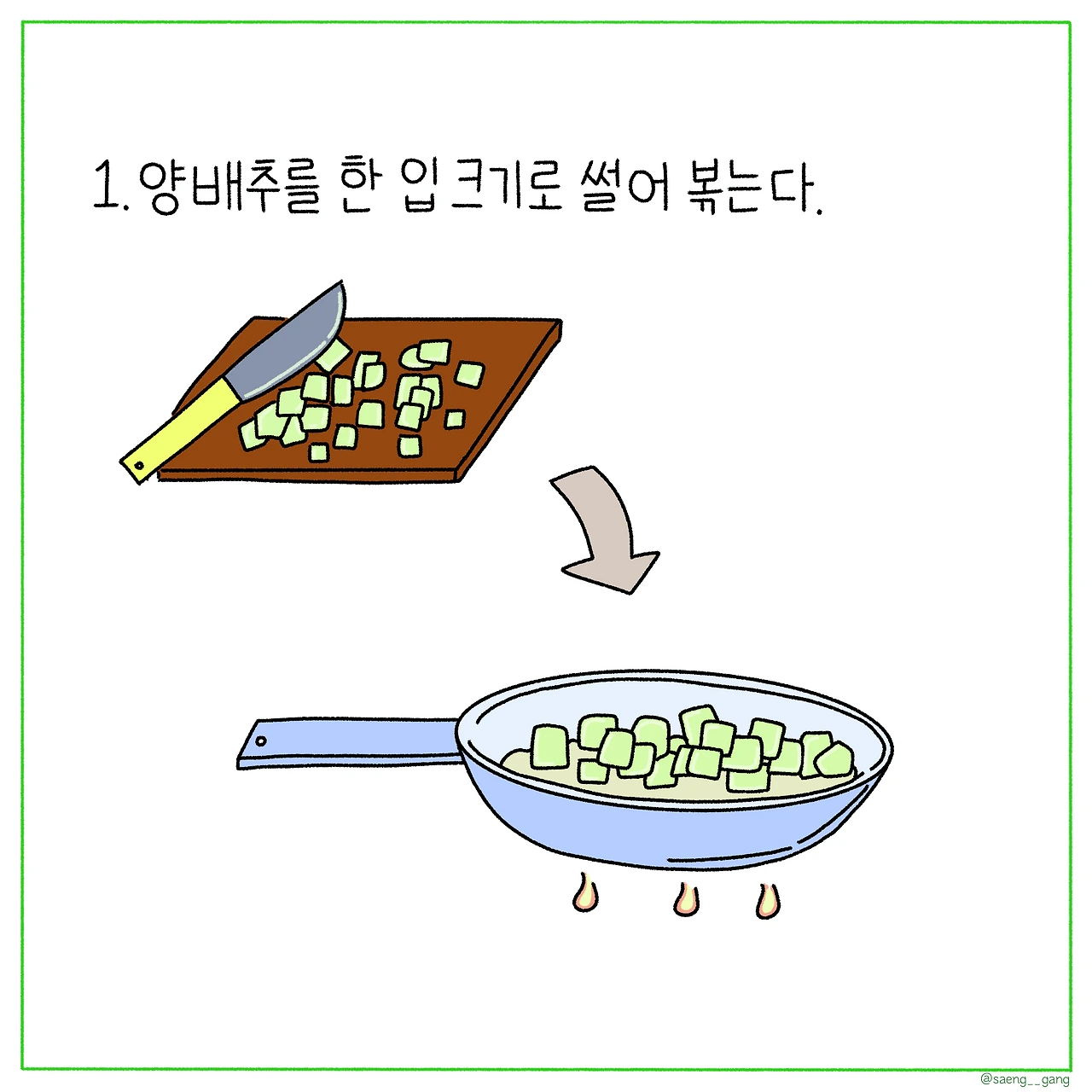 1. 양배추를 작게 썰고 기름은 두른 팬에 볶다가