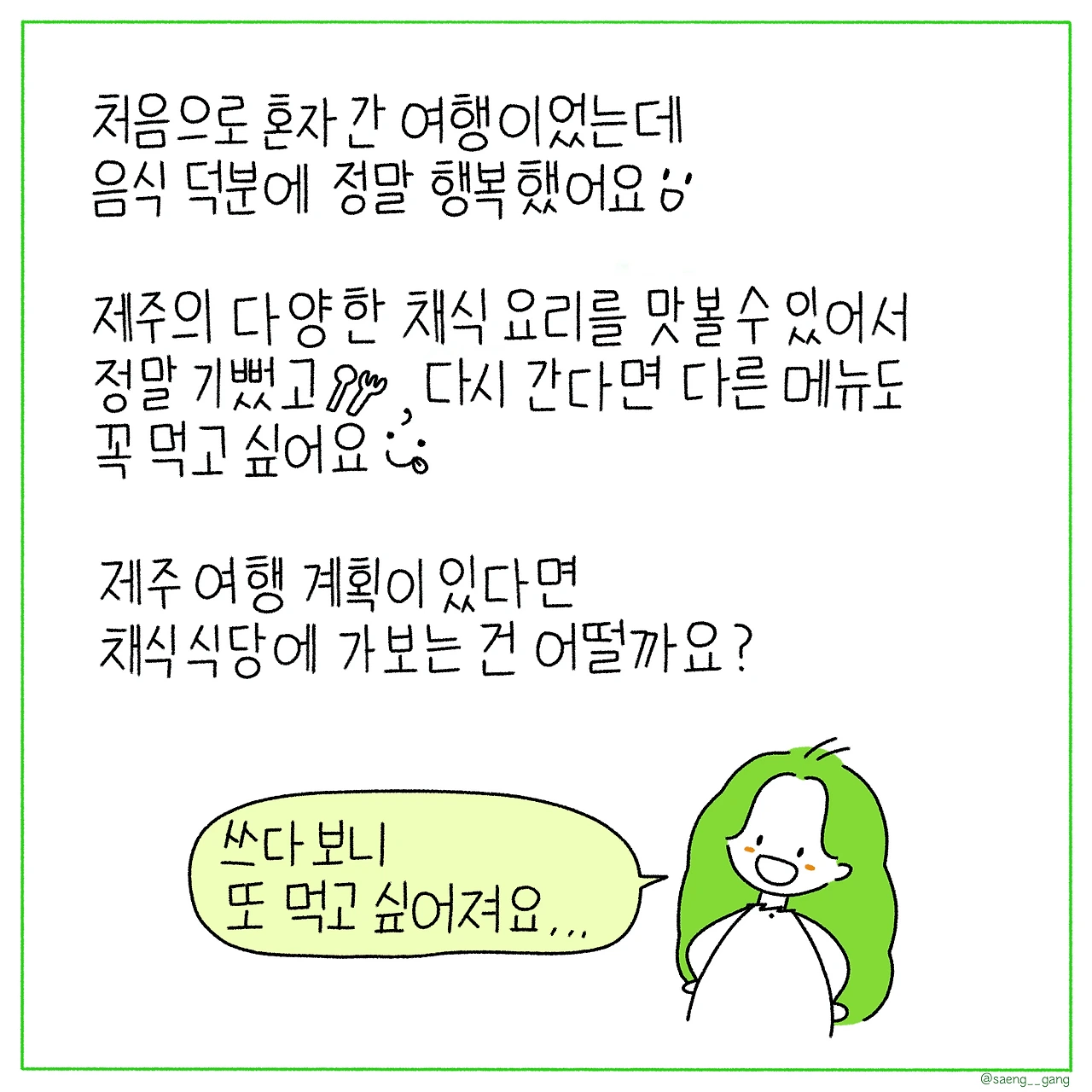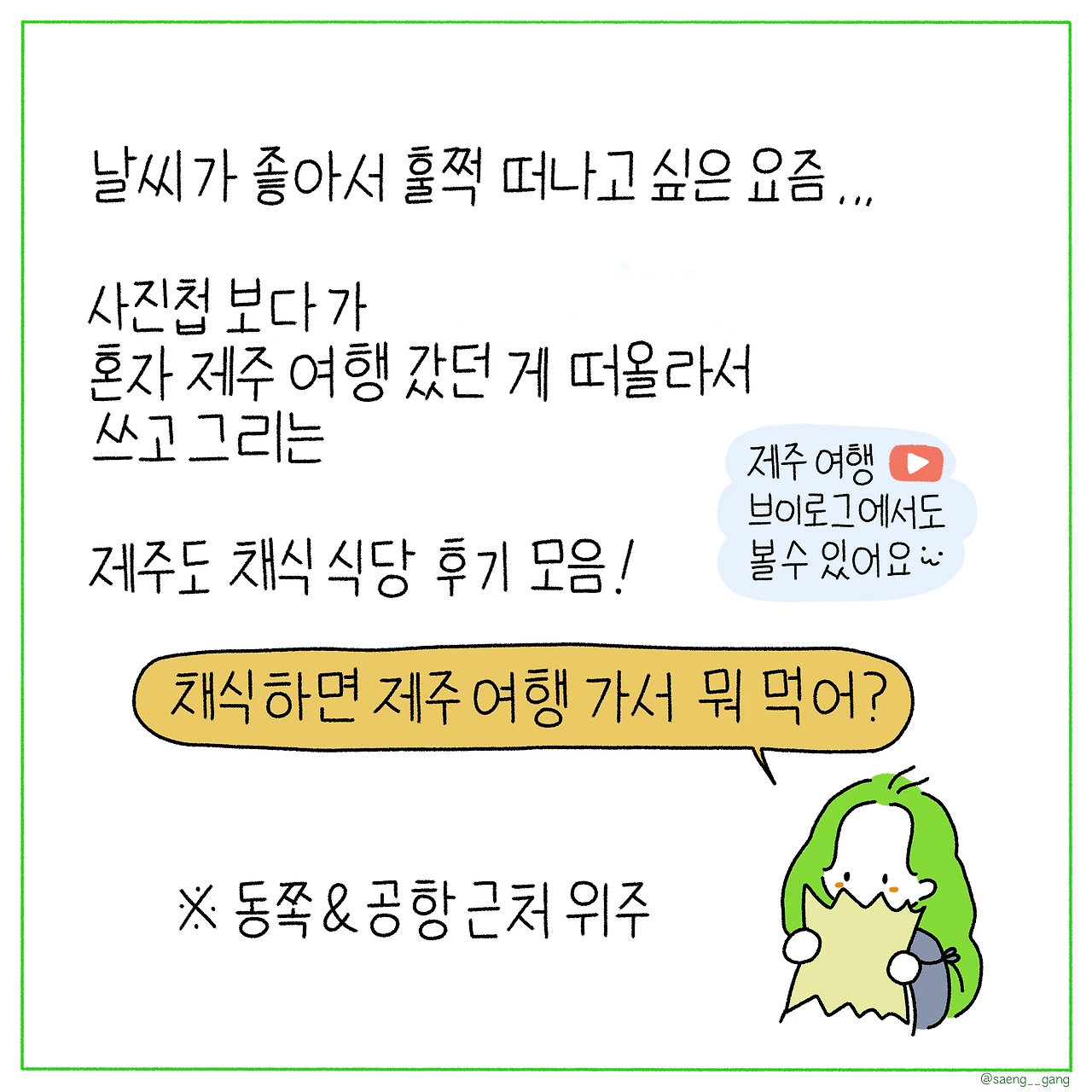 혼자 제주 여행 가서 먹은 채식 요리들을 소개합니다. 여행 가고 싶어서 쓰고 그려봤어요. (노는 게 제일 좋아..)