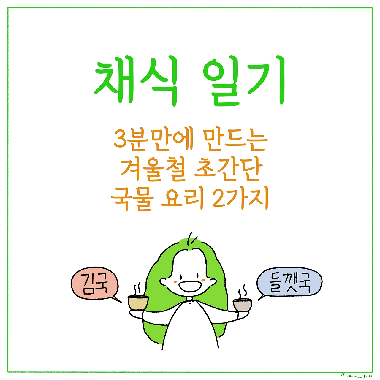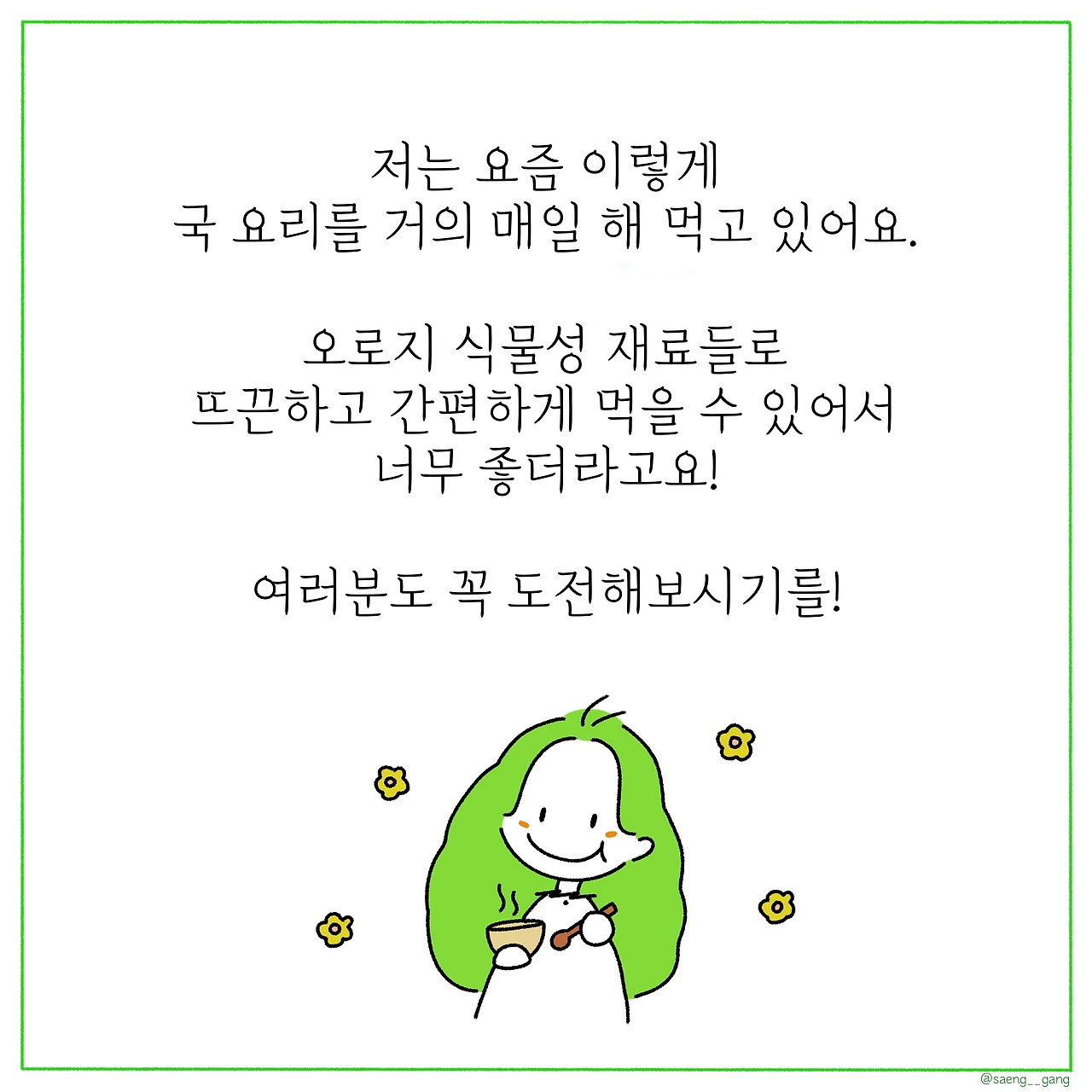 아침에 일어나면 추위에 굳은 몸을 풀기 위해 이리저리 움직이는데, 따뜻한 밥 한 끼 먹는 게 더 효과적이더군요. 오늘 소개한 국 요리들과 함께요. 간단한 채식 요리를 만들어보기 위해 여러 가지 시도들을 하면서 나의 몸과 마음에 대해 더 깊이 생각하게 되는 겨울입니다.