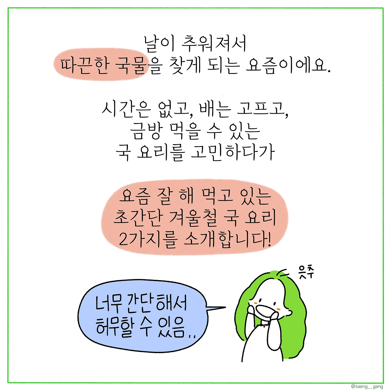 요즘 너무 춥죠.. 이런 날씨에 잘 어울리는 국 요리 2가지를 가져와보았어요! 오로지 식물성 재료들로 만들었습니다. 진짜 간단한데 맛은 간단하지 않아서 좋았어요.