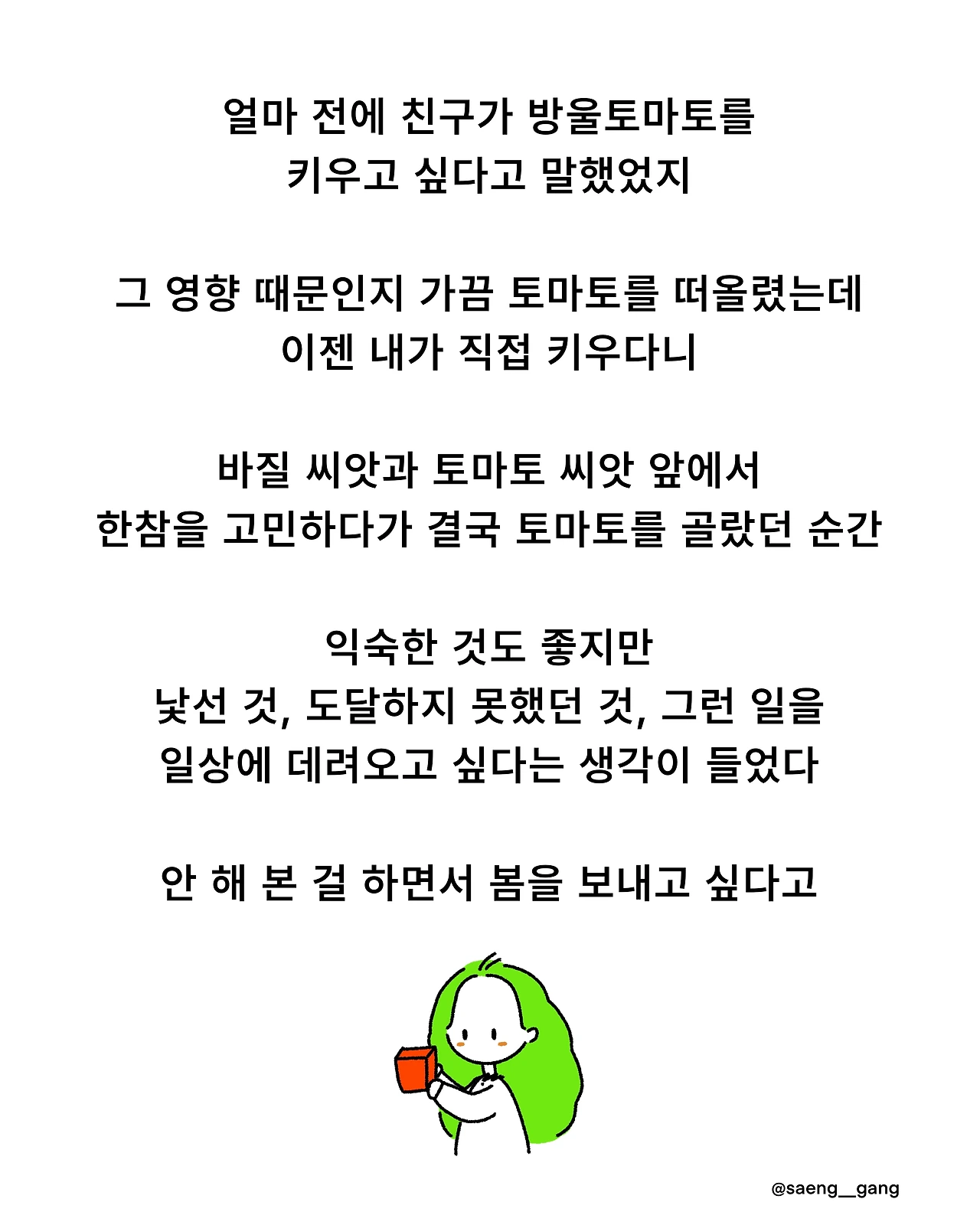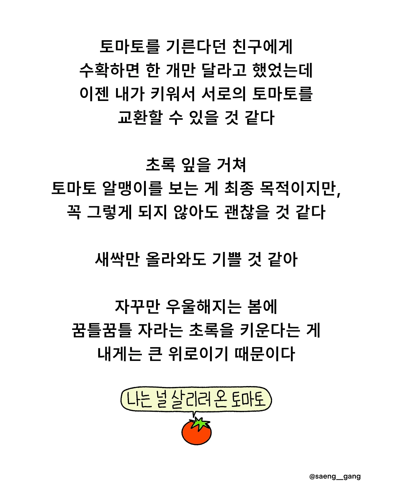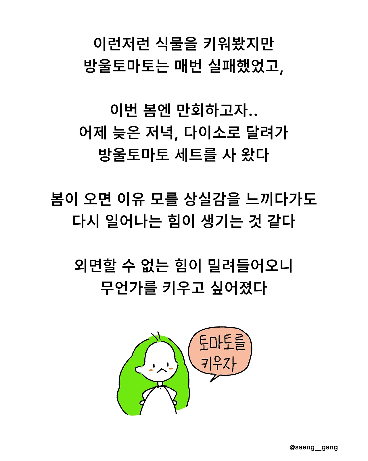 그래서 토마토를 키운다. 새싹이 나면 내 마음도 조금 상쾌해질 것 같아서.