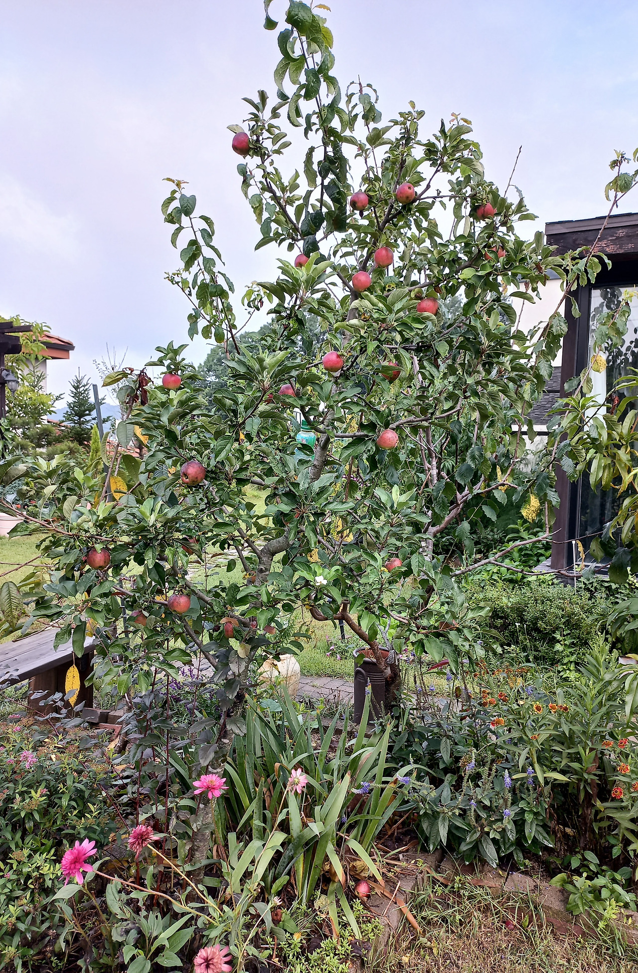 정원은 작은데 나의 욕심은 한없이 커서 온갖 나무와 식물을 심다 보니 늘 자리가 부족하다. 그래서 대부분의 나무를 주간형(위쪽으로 길쭉한 형태)으로 키우고 있다. 근데, 유독 말을 안 듣는 녀석들이 있다. 유전적으로 쩍벌로 타고난 놈들은 막을 길이 없다. 사과나무 이 녀석은 말을 듣기는 하면서도 고분고분하기는 싫은 모양이다. 하는 폼이 딱 우리 고딩이 아들이다.