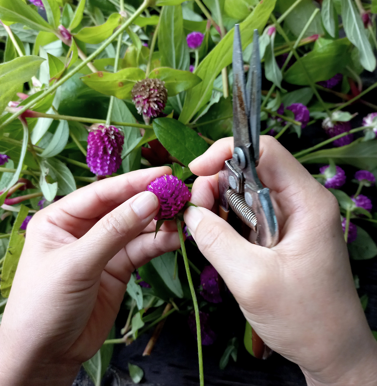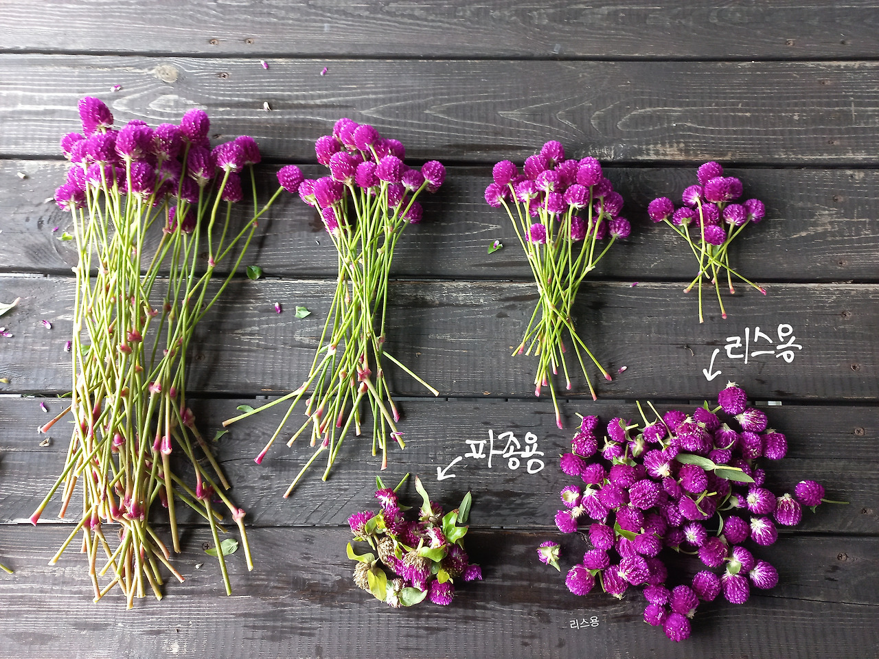 여물어가는 천일홍 꽃을 수확했다. 꽃을 말려 거실 장식도 바꾸어 주고 마른 화병에도 꽂을 생각이다. 꽃대가 단단히 여문 줄기를 중심으로 잎을 따고 길이 별로 정리했다. 꽃받침도 따는 것이 깔끔하다. 꽃대가 덜 여물어 부드러운 것은 드라이플라워로 만들었을 때 꽃을 받치는 힘이 없어 자꾸 구부러진다. 그래서 꽃대가 덜 여문 꽃들은 꽃만 따서 말린 다음에 리스를 만들 예정이다.