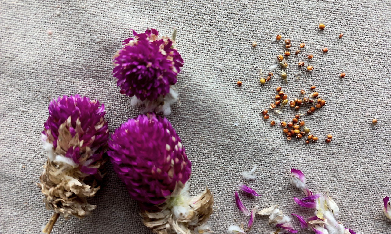 너무 여물어서 미워진 꽃은 채종을 한다. 솜털껍질에 쌓인 천일홍 씨앗을 그냥 심으면 발아율이 낮다. 딱딱한 솜털 껍질을 벗겨 속 씨앗을 분리해서 보관한다. 이렇게 심으면 대부분 쉽게 발아한다. 꽃잎 아래의 솜털껍질을 잘 벗겨 내면 갈색의 동그란 씨앗을 만날 수 있다. 정리한 꽃들은 길이별로 모아서 고무줄로 묶어 주방 한쪽에 잘 걸어 두었다.