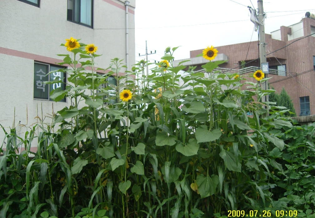 마당을 정리하면서 손을 대는 곳마다 막걸리병이며 유리병이며 각종 쓰레기가 호미 끝에 끊임없이 걸려 올라왔다. 특히 담장 밑이 심했다. 아예 마당 코너 한 곳은 시멘트 덩어리와 건축폐기물들이 수북이 작은 동산처럼 쌓여있었다. 흙으로 살짝 덮여 있어 처음에는 몰랐으나 호미로 파보니 콘크리트 덩어리와 철근 조각 등이 작은 동산을 이루고 있었다. 이곳이 개인이 관리하는 주택이 아니라 관사이다 보니 공사 후 공사 폐기물이나 쓰레기들을 제대로 처리하지 않고 마당에 묻어 버린 모양이었다. 담장을 따라 고구마를 캐듯이 쓰레기들을 캐내고 한쪽 코너 폐기물 동산은 도저히 방법이 없어 그냥 해바라기 씨앗을 심었다. 그렇게 하여 해바라기 동산이 만들어졌다.