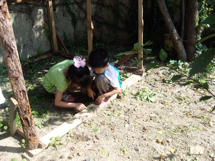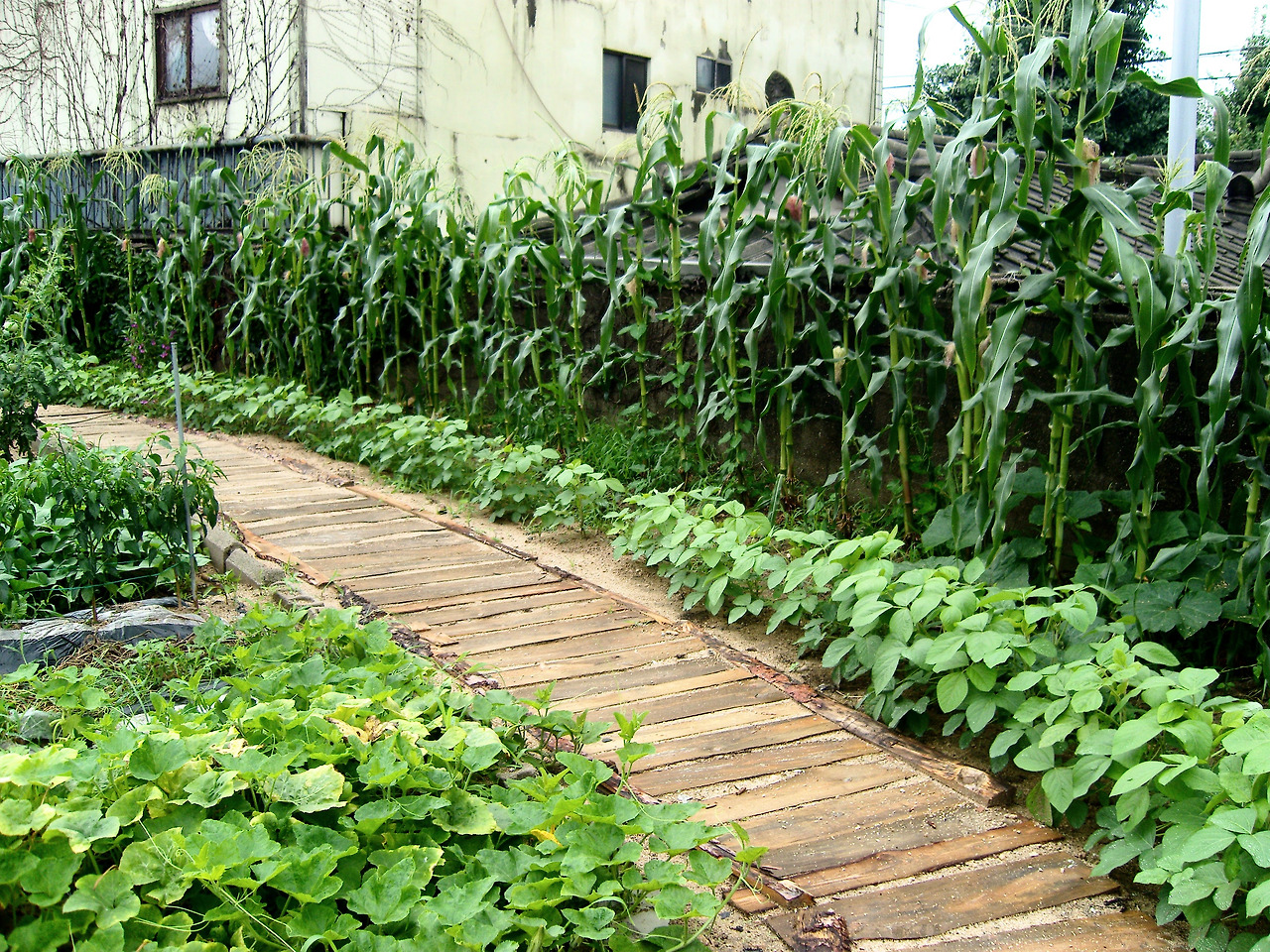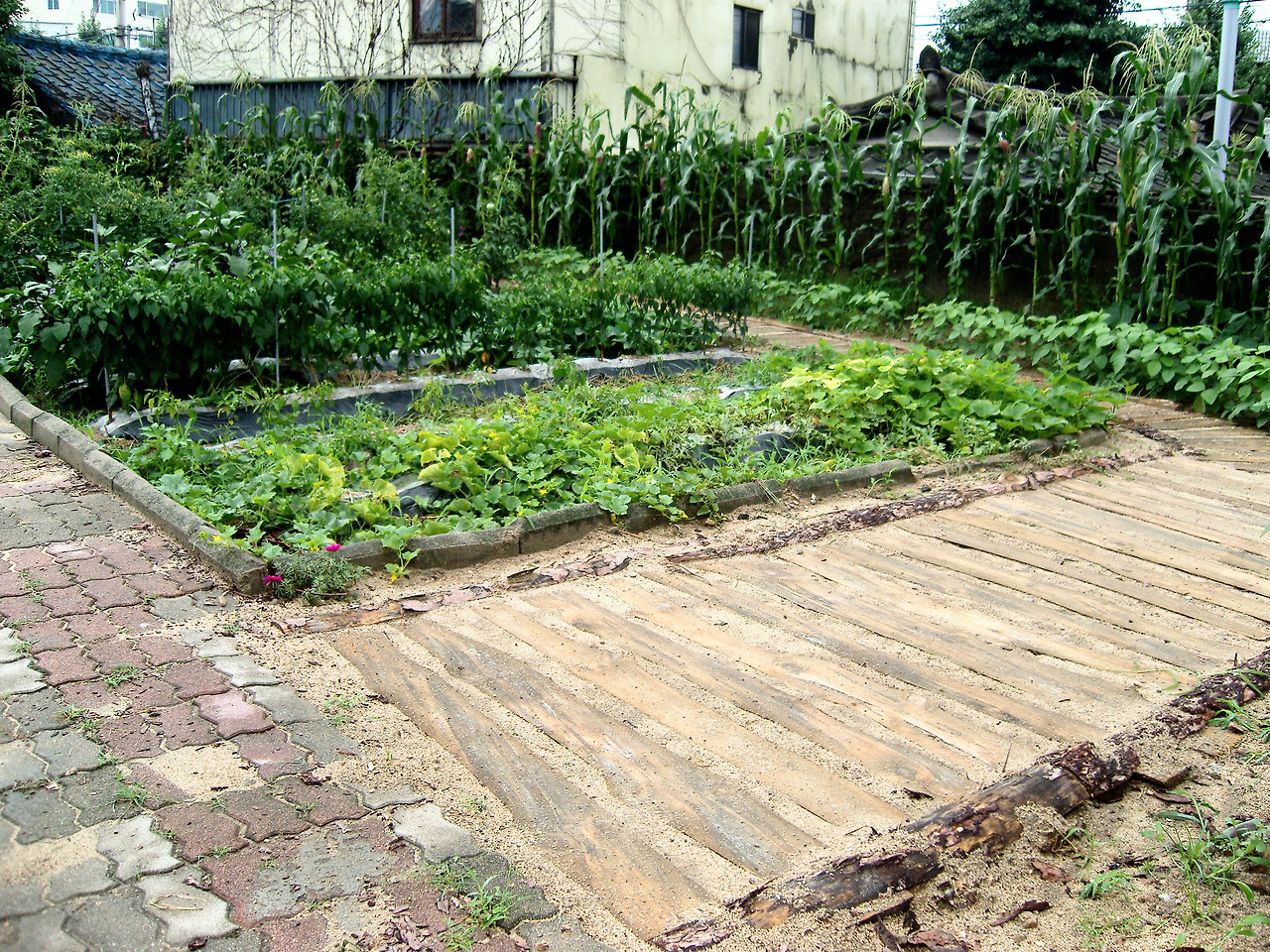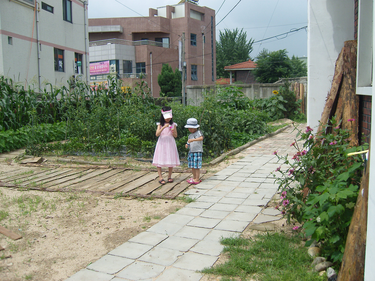 그렇게 보도블록 길을 손보고, 마당을 삽 한 자루로 평탄화 한 다음, 건물 바로 앞은 잔디마당을 만들고 대문 쪽 마당은 양쪽으로 텃밭을 만들었다. 아이들이 자전거를 탈 수 있는 길을 만들고 옆으로는 옥수수를 심어 여름이면 마치 옥수수가 가로수처럼 서 있는 자전거길을 만들었다. 아이들은 그 길을 기찻길이라고 했다. 인근 제재소에서 피죽(목재를 제재하고 남은 자투리나무)을 싼 값에 사 와서 깔았기 때문이다.