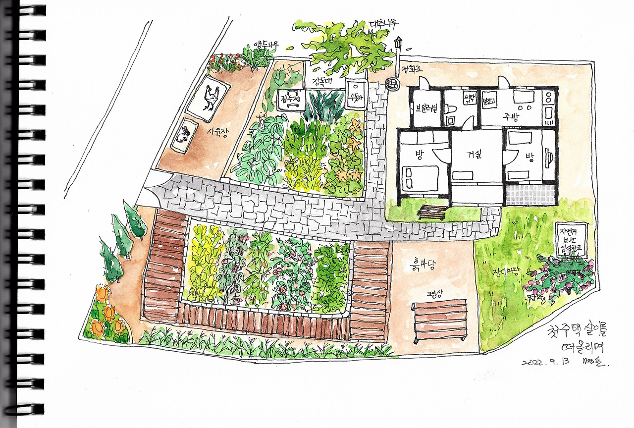 지도 앱의 위성사진과 예전에 찍어 두었던 사진들, 기억을 토대로 그려 본 첫 주택의 모습