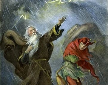 리어왕이군요! 진짜배기 셋째 딸의 진심은 알아보지 못하고, 거짓되고 아첨하는 첫째와 둘째 딸을 선택하는 커다란 실수를 범하더니, 결국 두 딸에게 팽 당하고 광야로 내쫓겼네요. 실성한 노인네가 돼버린 거죠.