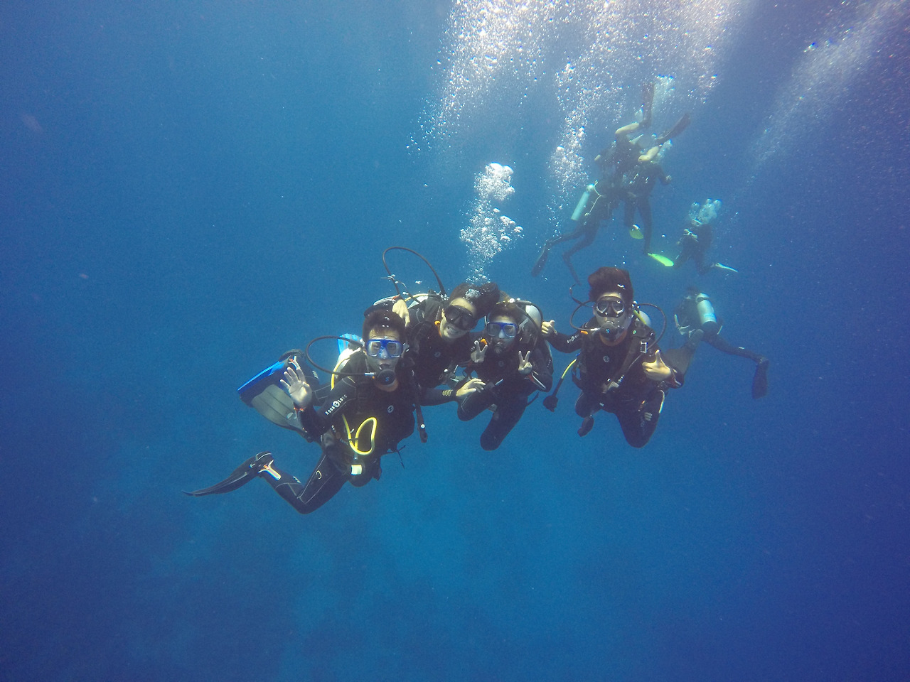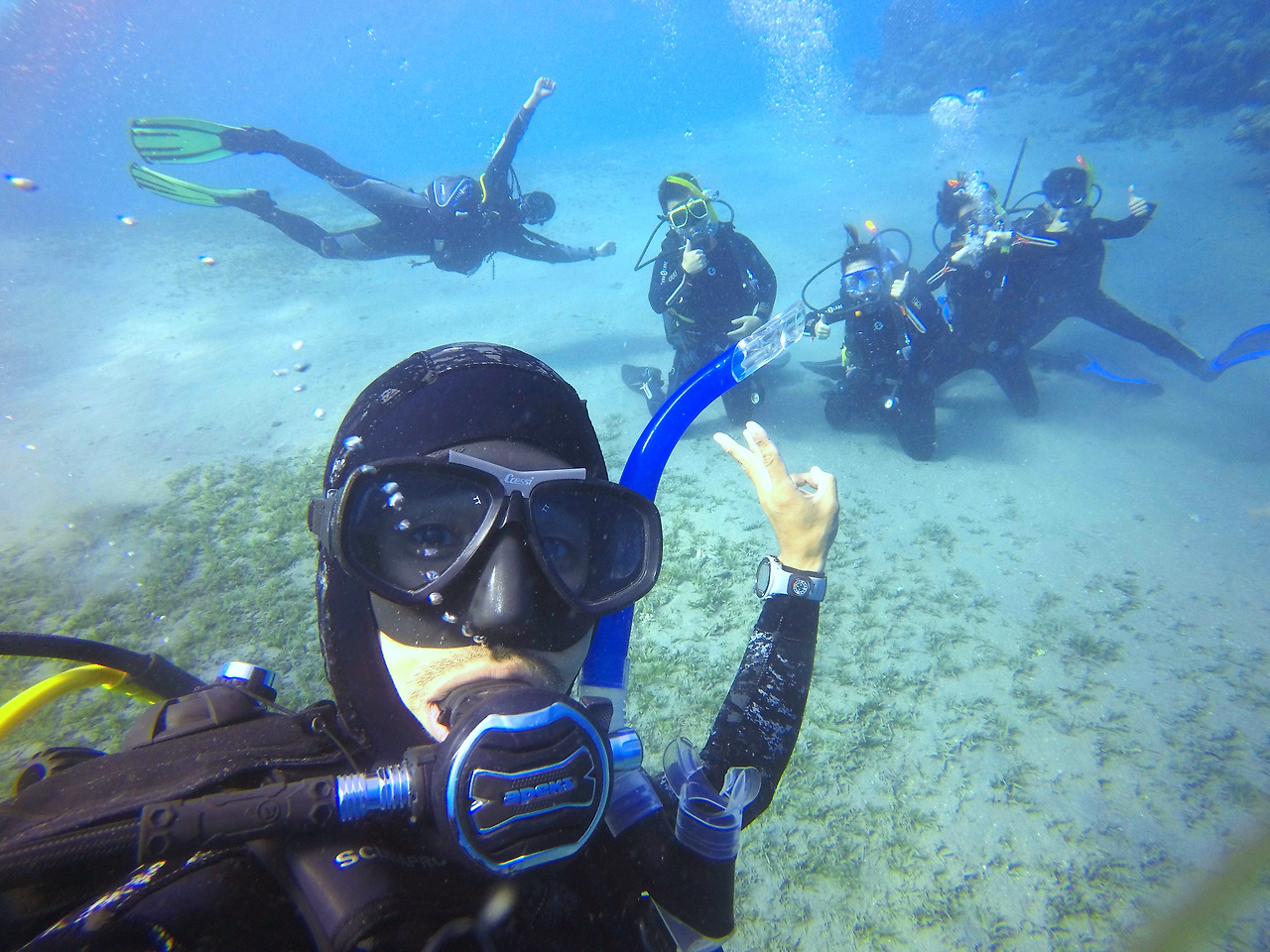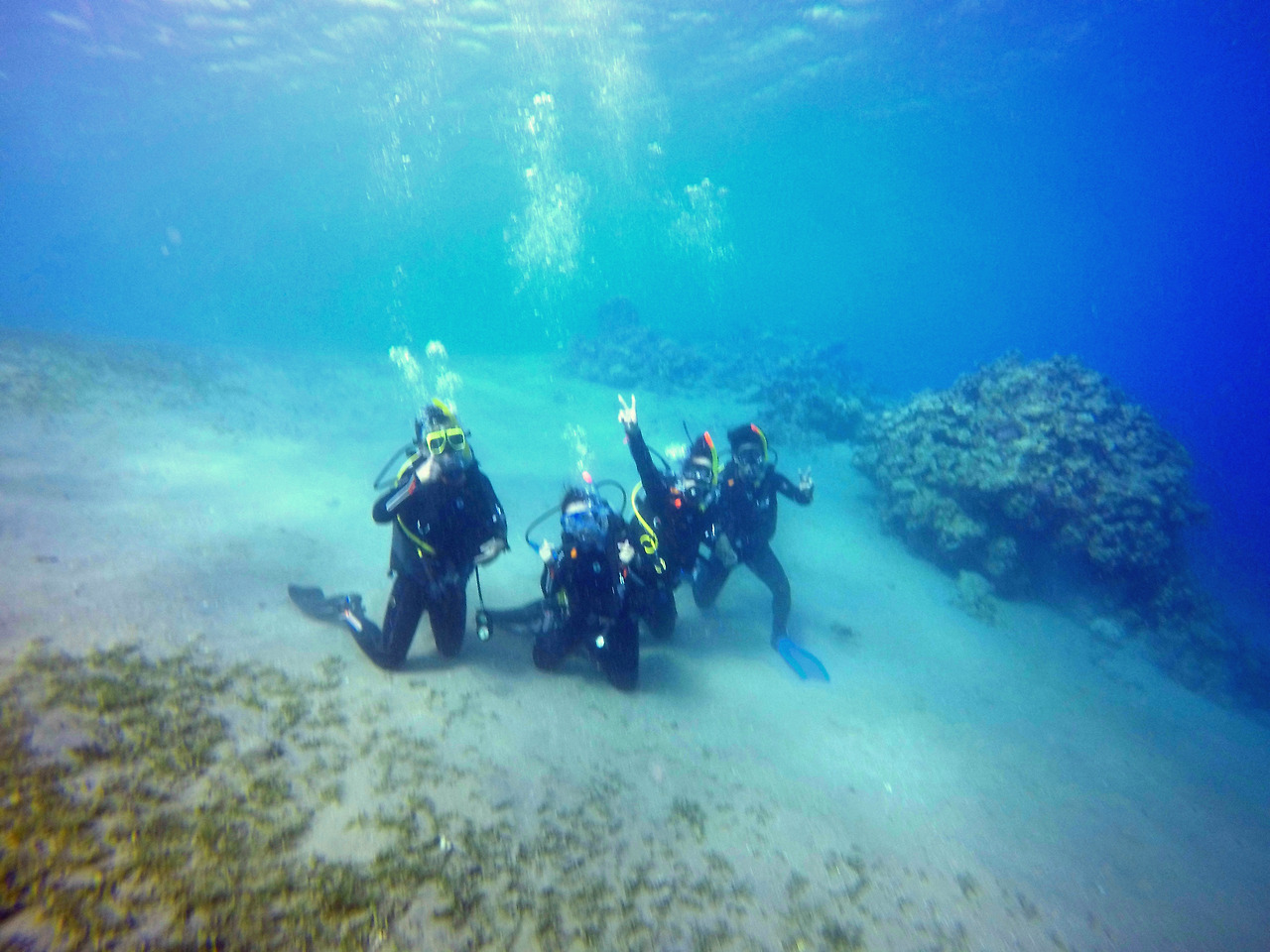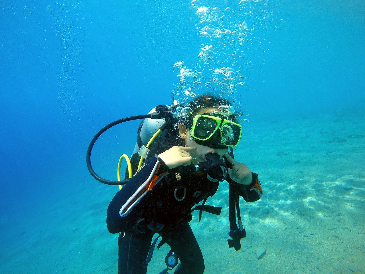 하지만 일단 물속에 들어가면 부력이 높아져 장비의 무게감은 더 이상 느껴지지 않았다. 그렇게 모두들 물 위에 둥둥 뜬 상태로 오리발과 스노클 마스크를 착용하고 강사님의 신호에 맞추어 디플레이션 버튼을 눌러 BCD의 공기를 조금씩 빼며 물아래로 내려갔다. 2m 정도의 얕은 수심에 무릎을 꿇고 앉으면 그때부터는 이론 수업에서 배운 수신호로 수업이 진행되었다. 제일 먼저 물속에서 해야 할 미션들은 이퀄라이징과 마스크에 들어온 물 빼기, 마스크 벗었다 쓰기, 입에서 빠진 호흡기 찾기, 주 호흡기에서 보조 호흡기로 바꿔 물기 등과 같은 생존 스킬들이었다.