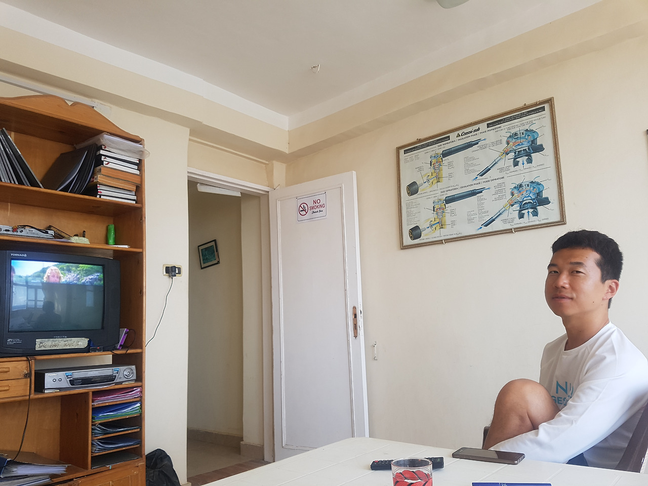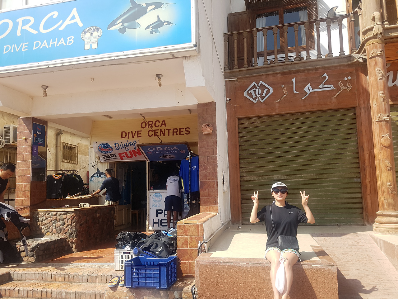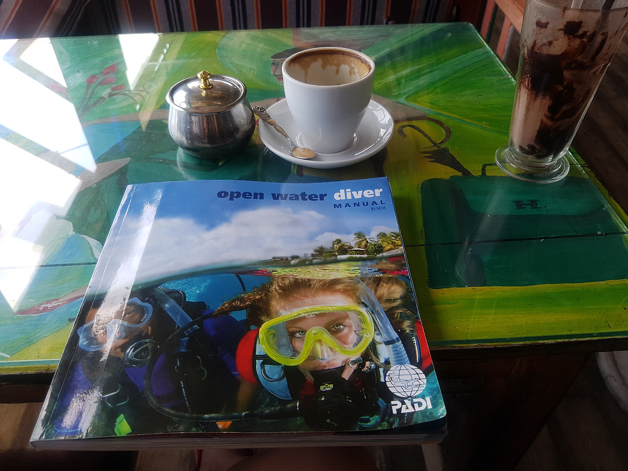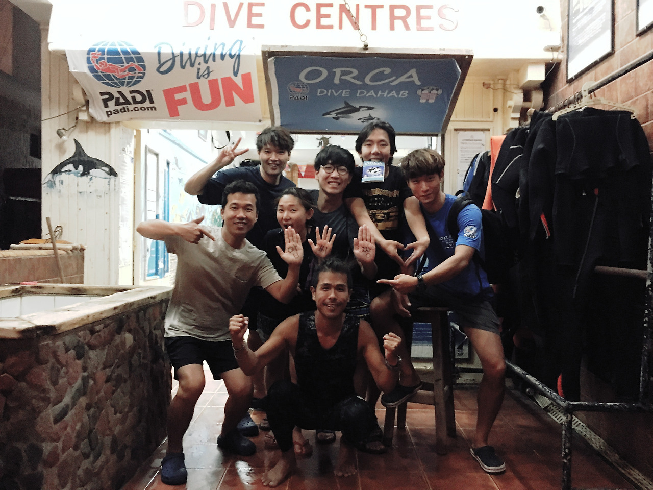 앞으로 한 달간 같이 살게 된 룸메이트들은 우리보다 하루 정도 먼저 다합에 도착해 스쿠버다이빙 자격증 과정을 밟고 있는 중이었다. 그래서 우리도 그 친구들이 등록한 오르카라는 다이빙 샵에 1인당 260달러(약 29만6천원)를 내고 등록 한뒤 일정을 맞춰 같이 수업을 받기로 했다. 오픈워터 자격증+어드벤스드 자격증까지 모두 포함해서 이 가격. 우리나라에서 따려면 100만원 정도 들었을텐데 역시 다합이다. 첫날은 세 시간짜리 교육 비디오를 보고 가장 기본이 되는 이론에 대한 설명을 들었다. 둘째 날은 아침 일찍 카페에서 강사님을 만나 교재 뒤에 붙어 있는 연습 문제들을 풀고 오후에 룸메이트들과 처음으로 바다에 들어갔다.
