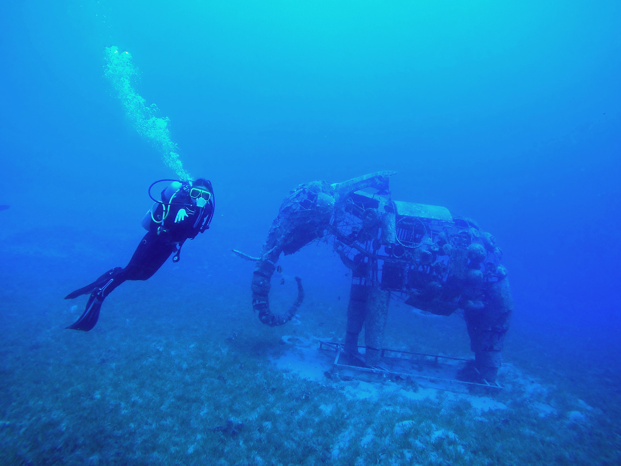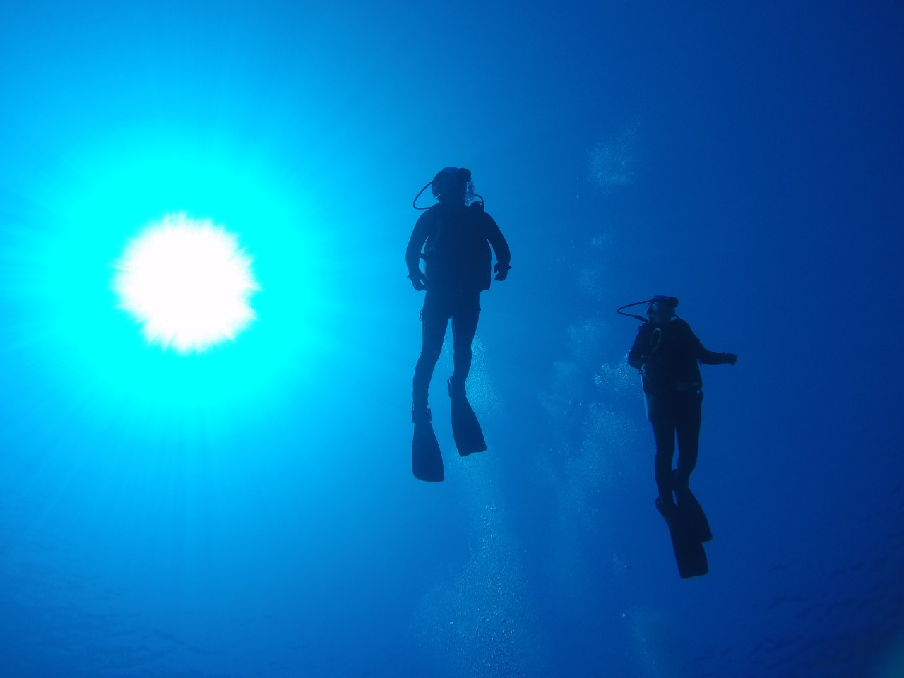 우여곡절 끝에 30m 지점까지 내려간 우리는 강사님의 지휘 하에 질소 마취 여부 테스트를 시작했다. 질소 마취란 수심이 깊어질수록 공기통 속 질소의 압력이 높아져 인체에 마취 증상을 일으키게 되는 현상을 말한다. 질소 마취가 이루어지면 판단력이 흐려져 여러 가지 사고로 연결될 수 있으니 간단한 산수 문제를 풀어 자신이 멀쩡하다는 것을 증명해 주어야 하는 것이다. 예를 들어 강사님이 손가락으로 3을 보여주면 10이 되기 위해 필요한 나머지 수인 7을 손으로 표시해주면 되는 것. 그런데 강사님이 문제를 내는 도중 장난기가 도지셔서 남편에게 양손의 세 번째 손가락을 들어 보여 주셨다. 그걸 본 남편은 또 센스 있게 양손의 세 번째 손가락만 접어서 답을 표시했다. 그걸 보고 어찌나 웃기던지 다들 입에서 공기방울이 오천 개씩을 보글보글 올라오고 난리였다.