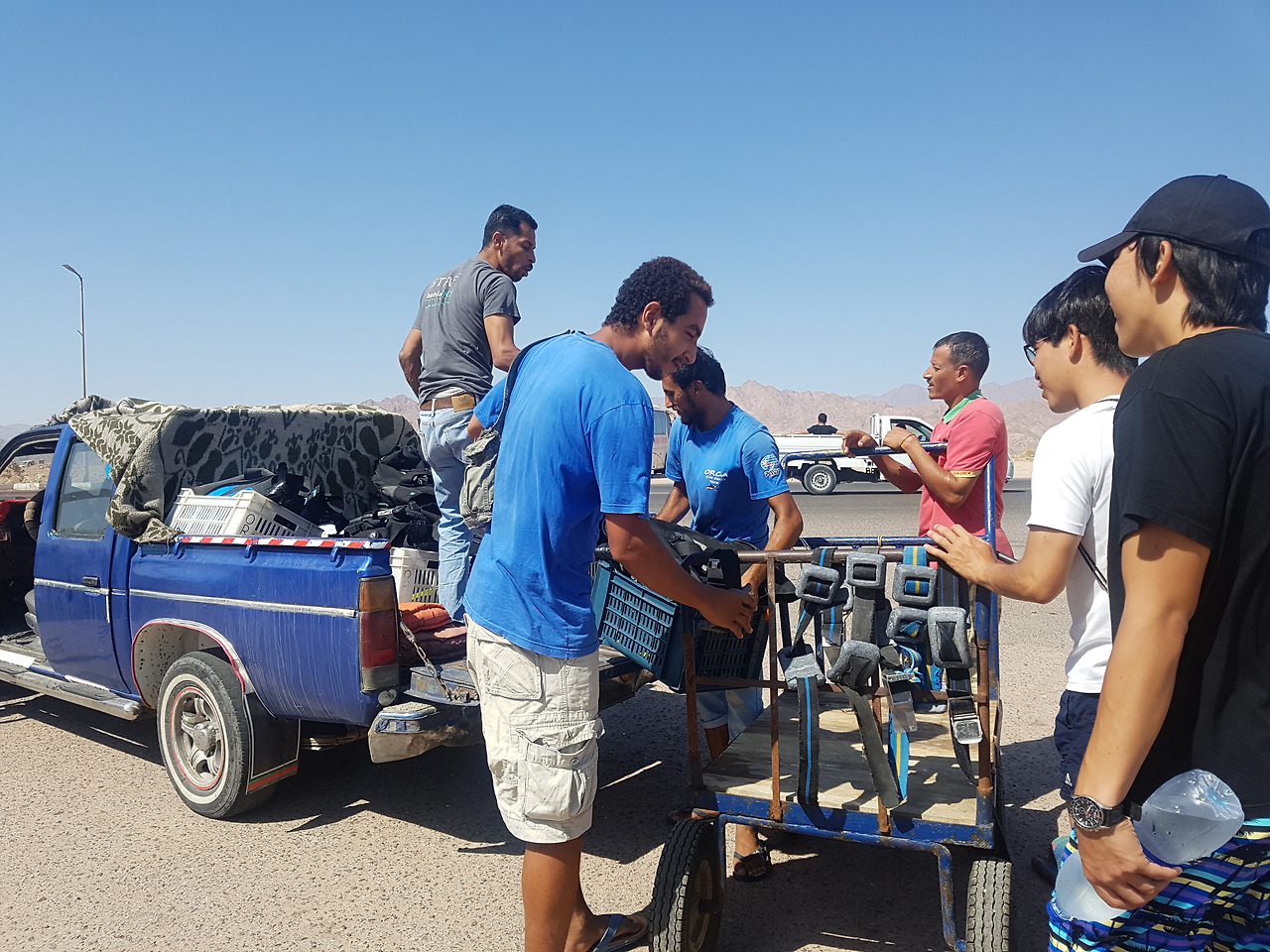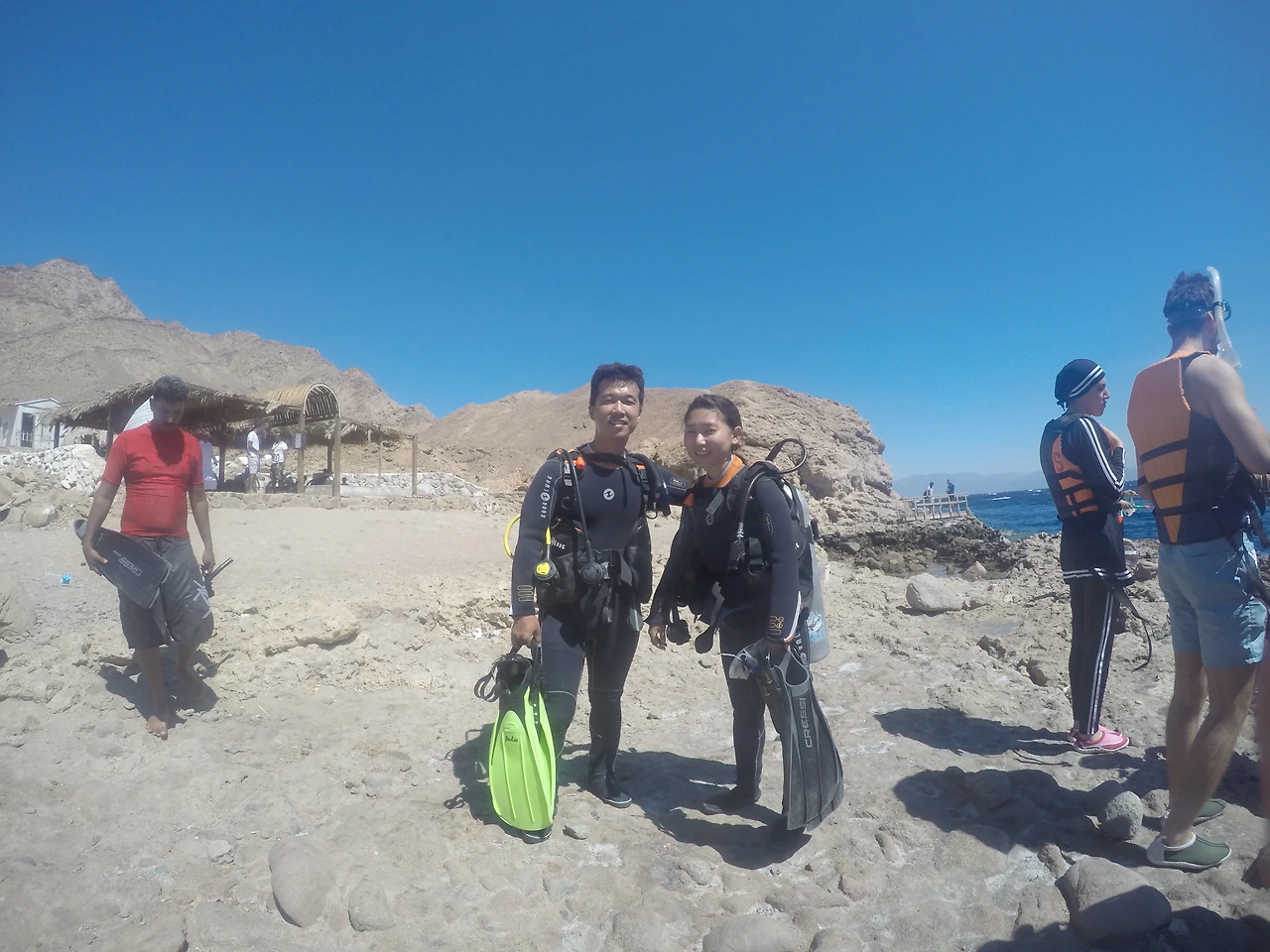 보트 다이빙 당일 우리 집 식구 네 명과 같은 날 다합 들어와서 친해지게 된 커플 그리고 처음 본 두 명의 다이버들과 함께 택시에 한 가득 장비를 싣고 선착장으로 향했다. 가이드들이 배 안으로 장비를 옮기는 동안 우리는 선착장에 서서 바다를 내려다봤는데 얼마나 물이 맑은지 거대한 가오리가 다 보일 정도였다.