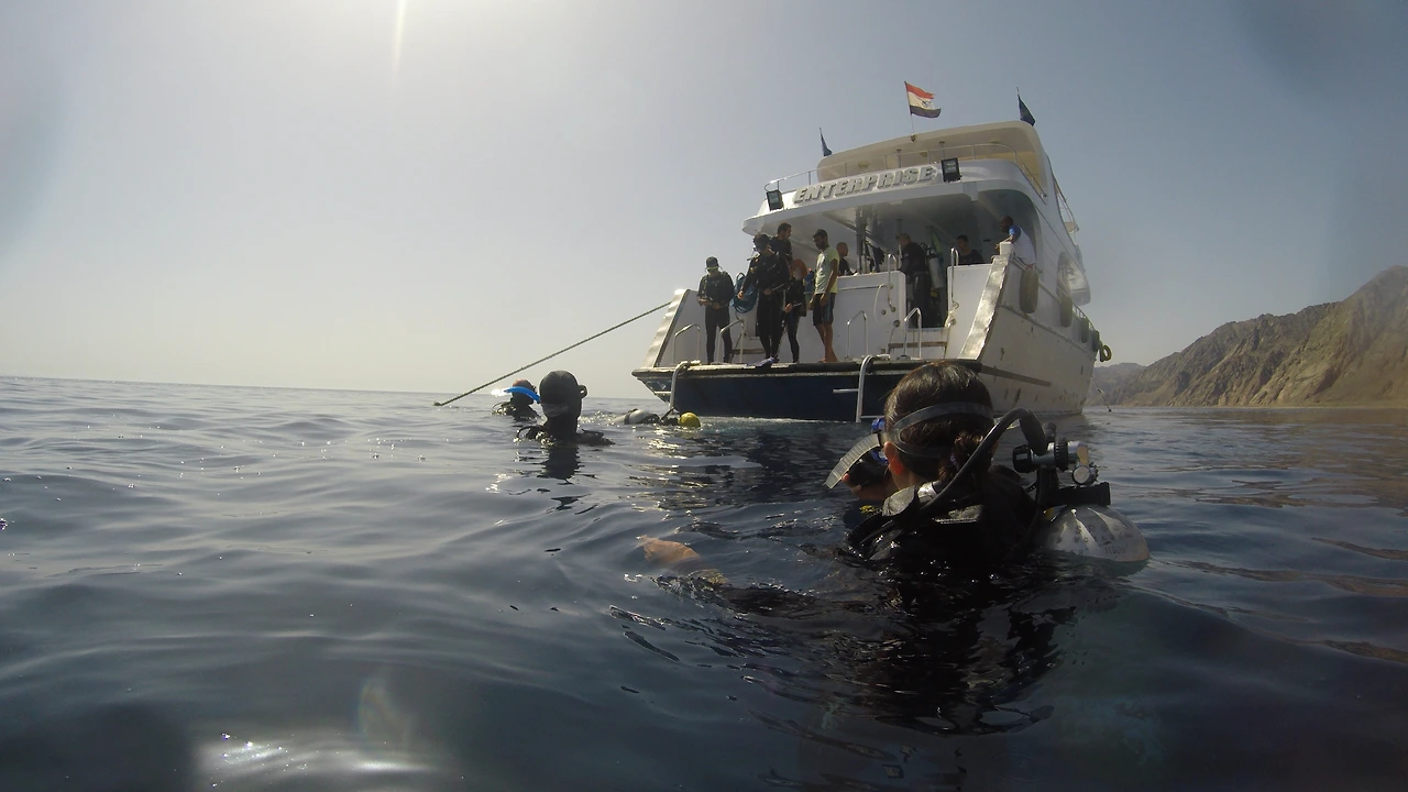 배가 바람 한 점 없이 잔잔한 바다 위에 파장을 만들며 항해하는 동안 육지에는 이국적인 이집트 특유의 풍경이 여유롭게 흘러갔다. 더할 나위 없이 좋은 날씨에 취해 뱃머리에 누워 햇볕도 쬐고 배에서 제공된 조식도 먹으며 오늘 다이빙을 하게 될 '가브리엘빈트' 포인트에 대한 설명을 들었다. 그리고 포인트 도착 전 각자의 장비를 점검한 뒤 다이빙 슈트를 챙겨 입었다.