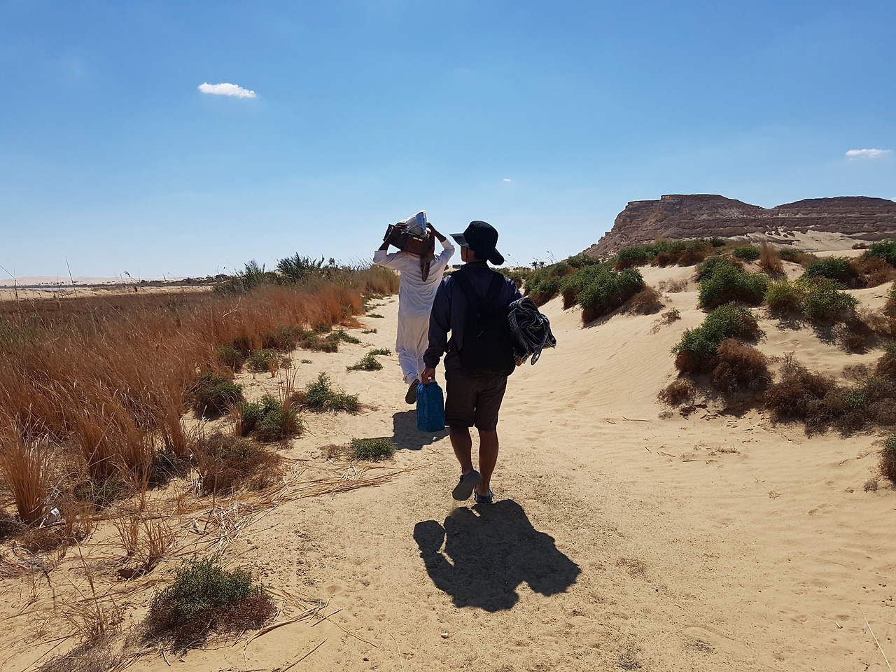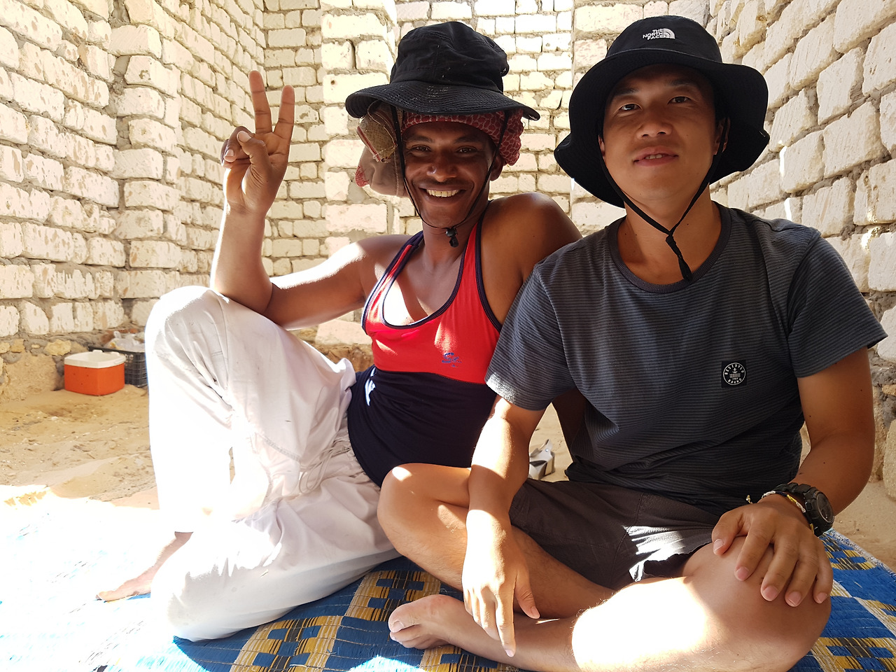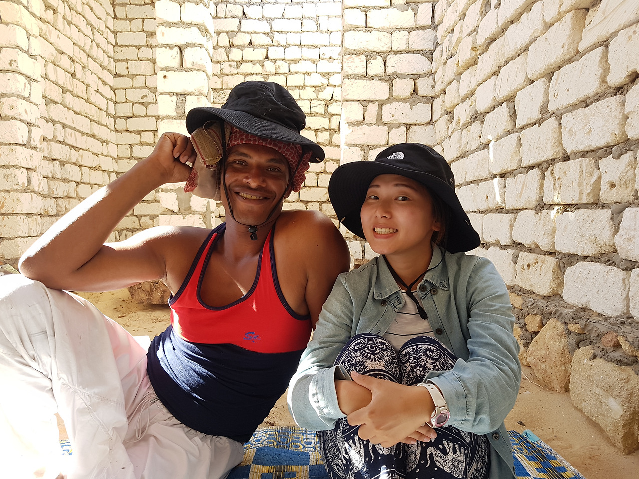 백만 년 전 발자국을 보고 한바탕 상상의 나래를 펼쳤더니 슬슬 배가 고파왔다. 모함메드도 나의 뱃속에서 흘러나오는 꼬르륵 소리를 들었는지 한적한 장소에 오토바이를 세우고 좌석 아래에서 이것저것 물건들을 꺼냈다. 줄줄이 나온 물건들은 돗자리, 물 한 통, 무언가가 잔뜩 담겨 있는 바구니. 이것들을 나눠 들고 무작정 모함메드의 뒤를 따라 걸었다. 그는 발이 푹푹 빠지는 모래 언덕을 긴 다리로 성큼성큼 올라갔다. 다리가 짧은 우리는 거의 뛰다시피 그의 뒤를 따라갔다. 그리고 도착한 곳에는 왠 짓다 만 집 한 채가 서있었다.