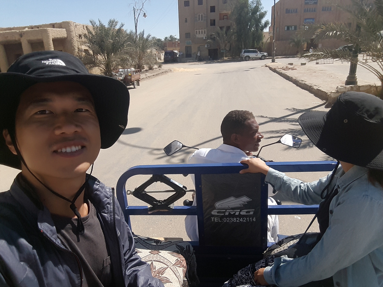 마을 오솔길을 달리는 동안은 몇 가지 주의사항이 있었다. 지붕이 없는 오토바이의 특성상 잎과 과실이 무성한 대추야자 나무가 나타나면 가지에 부딪히지 않도록 스스로 몸을 낮춰 장애물을 피할 것. 게임은 어릴 적 문구점 앞에 쪼그리고 앉아 범우주적 집중력을 발휘하며 즐겼던 갤러그처럼 단순하면서도 재미있었다. 그리고 절대 손잡이를 놓지 말 것. 손잡이라고 해봤자 경운기 뒷좌석 같이 생긴 수레의 기둥을 붙잡는 수준이었지만 태초의 오프로드 같이 순수 험함의 진수를 보여주는 길 위에서는 이것이야말로 생명줄이나 다름없었다. 너무 신이 난 나머지 손을 놓고 휴대폰의 카메라를 켜다가 영원히 지구를 떠날 뻔한 순간을 떠올리면 지금도 아찔하다.