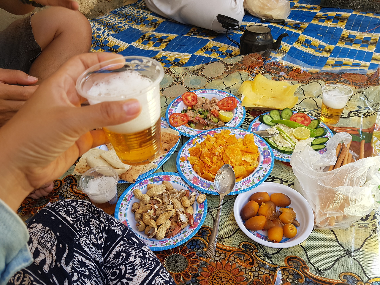 나뭇가지가 타닥타닥하고 기분 좋은 소리를 내며 타오를 동안 모함메드는 돗자리 한편에 앉아 물통에 담아온 물로 야채와 그릇들을 씻었다. 그리고 그 자리에서 참치 샐러드 한 접시를 뚝딱 만들어 냈다. 샐러드를 시작으로 바구니 속 재료들이 차례차례 그의 손을 거쳐 돗자리 식탁 위에 오르기 시작했다. 오이와 레몬을 곁들인 치즈, 잘 익은 대추야자, 감자칩, 막대 과자, 땅콩, 얇게 구운 빵까지. 꽃무늬 접시에 얌전히 담긴 음식들은 평범하면서도 특별했다. 그는 마지막으로 맥주 한 병을 꺼내 일회용 컵에 정성 들여 맥주를 따랐다. 건배!