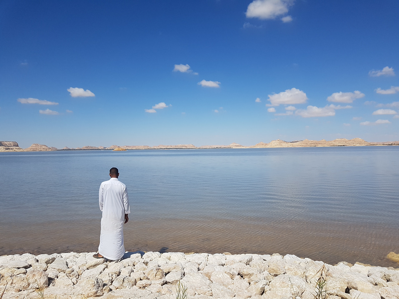 실핏줄처럼 가늘고 정교하게 이어진 오솔길을 벗어나자 사람의 흔적이라고는 우리의 그림자뿐인 진짜 시와가 나타났다. 파란 하늘은 듬성듬성 모여 앉은 구름들과 여유로운 한때를 보내고 있었고, 그것보다 더 푸르른 호수는 바람이 만든 주름진 미소를 지어 보이며 시간을 흘려내고 있었다. 호숫가 돌들은 오랜 시간 물결에 실려 온 소금을 걸친 채 햇볕 아래 눈부시게 빛났다. 그리고 그 곁에 잠시 오토바이를 세운 모함메드가 서있었다. 발목까지 내려오는 새하얀 전통의상을 입은 모함메드. 그는 이 동네와 지나치게 잘 어울렸다. 이곳에 살기 위해 태어난 것처럼 말이다.