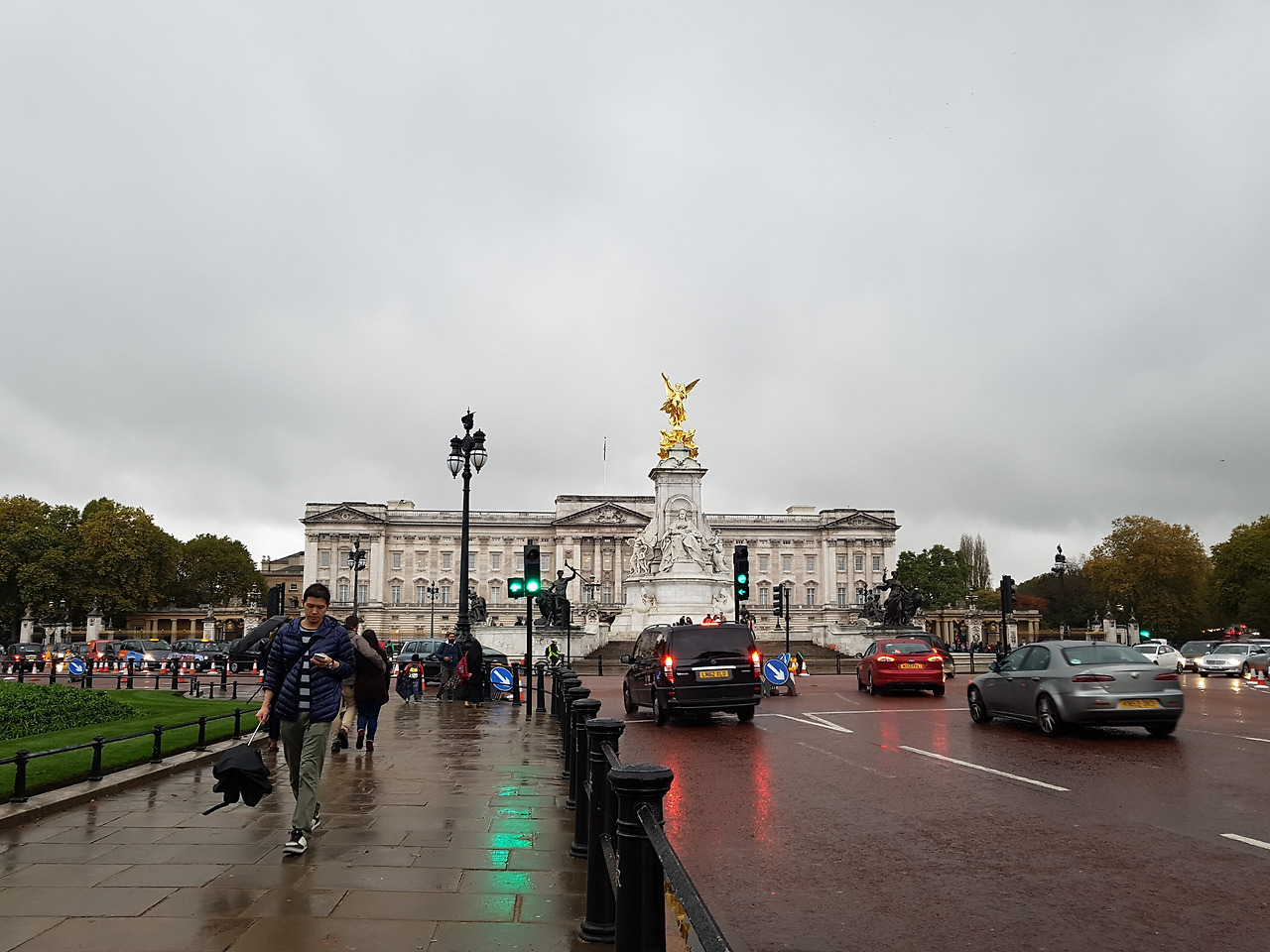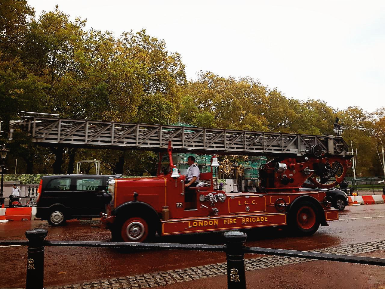 여기까지 보고 나니 갑자기 피로감이 마구 몰려오기 시작했다. 영국의 우중충한 낭만도 피로 앞에서는 그냥 축축한 가을일뿐. 빨리 숙소로 돌아가 뜨거운 물에 샤워하고 쉬고 싶은 마음이 간절했다. 하지만 오늘의 하이라이트 버킹엄 궁전을 건너뛸 수는 없다는 마음에 열심히 걸어가는데, 갑자기 옆으로 빨간 차들이 지나갔다. 영국의 클래식 소방차였다. 아니 뭐 이런 것까지 예쁘고 난리람. 신기한 것을 하나 보고 나니 다리에 힘이 생긴 것 같은 기분이 들었다. 그때 멀리서 버킹엄 궁전이 서서히 모습을 드러냈다.
