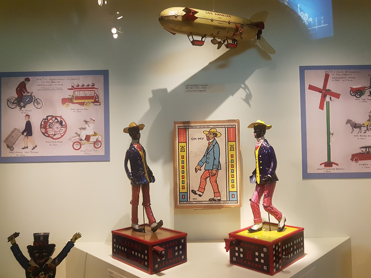 이어서 진열되어 있는 탭댄스 추는 '앨라배마 콘 지거 Alabama Coon Jigger'라는 이름의 장난감이다. 이것도 역시 태엽을 감으면 저 무대 위에서 인형이 탭댄스를 춘다고 한다. 그래서 무릎 관절이 섬세하게 움직일 수 있도록 분리되어 있는 것을 볼 수 있다. 이것도 유튜브에 움직임을 볼 수 있는 영상이 있어서 첨부해본다.