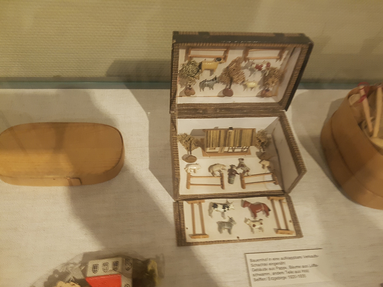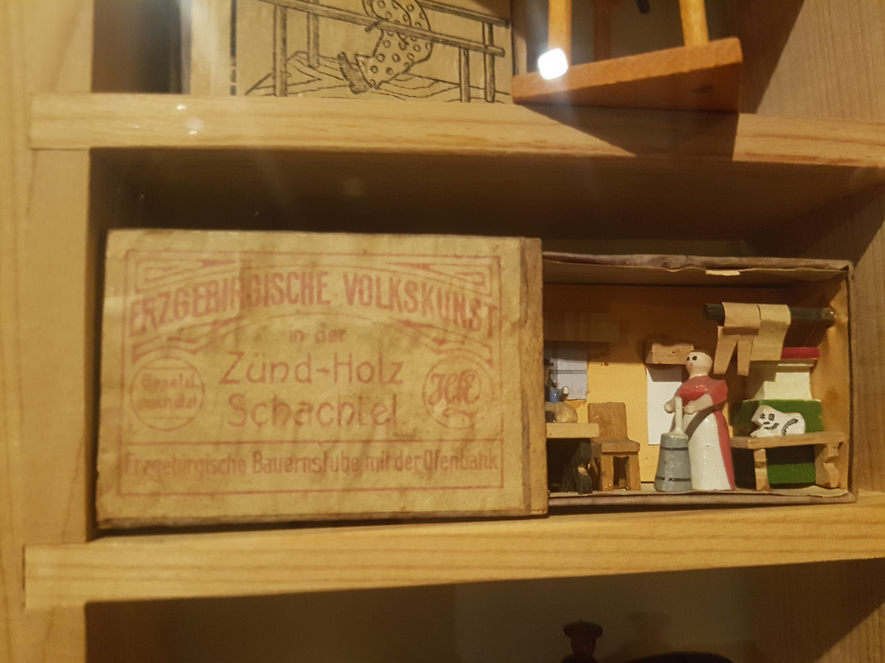 다음으로 만난 장난감들은 섬세함의 끝을 보여주는 것들이었다. 'Erzgebirgische Volkskunst'라는 이름의 장난감 회사가 만든 성냥갑 인형 세트이다. 제품 패키지에 보면 '성냥 상자 Zụ̈nd•holz Schachtel'라고 쓰여있는 것을 볼 수 있는데 인형과 작은 가구들까지 저 작은 공간 안에 알차게 들어 있다. 자세히 보면 한켠에 고양이 인가 강아지 같은 동물도 한 마리 앉아 있는 것도 보인다.