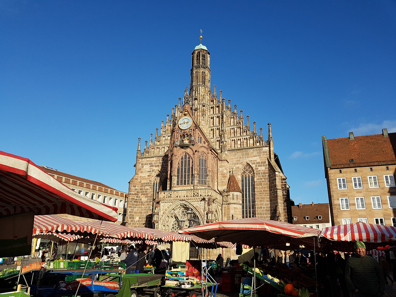메인 광장도 지난번 그 모습이 아니었다. 햇볕 아래 웅장한 '프라우엔 교회 Nürnberg Frauenkirche'의 아름다운 모습이 드러나자 역시 여행은 날씨가 다한다는 말이 다시 한번 떠올랐다. 12시가 되면 시계탑 안의 인형들이 나와 춤을 춘다고 하는데, 내가 간 시간은 이미 오후 3시. 아쉽지만 이 모습 그대로도 너무 좋았다.