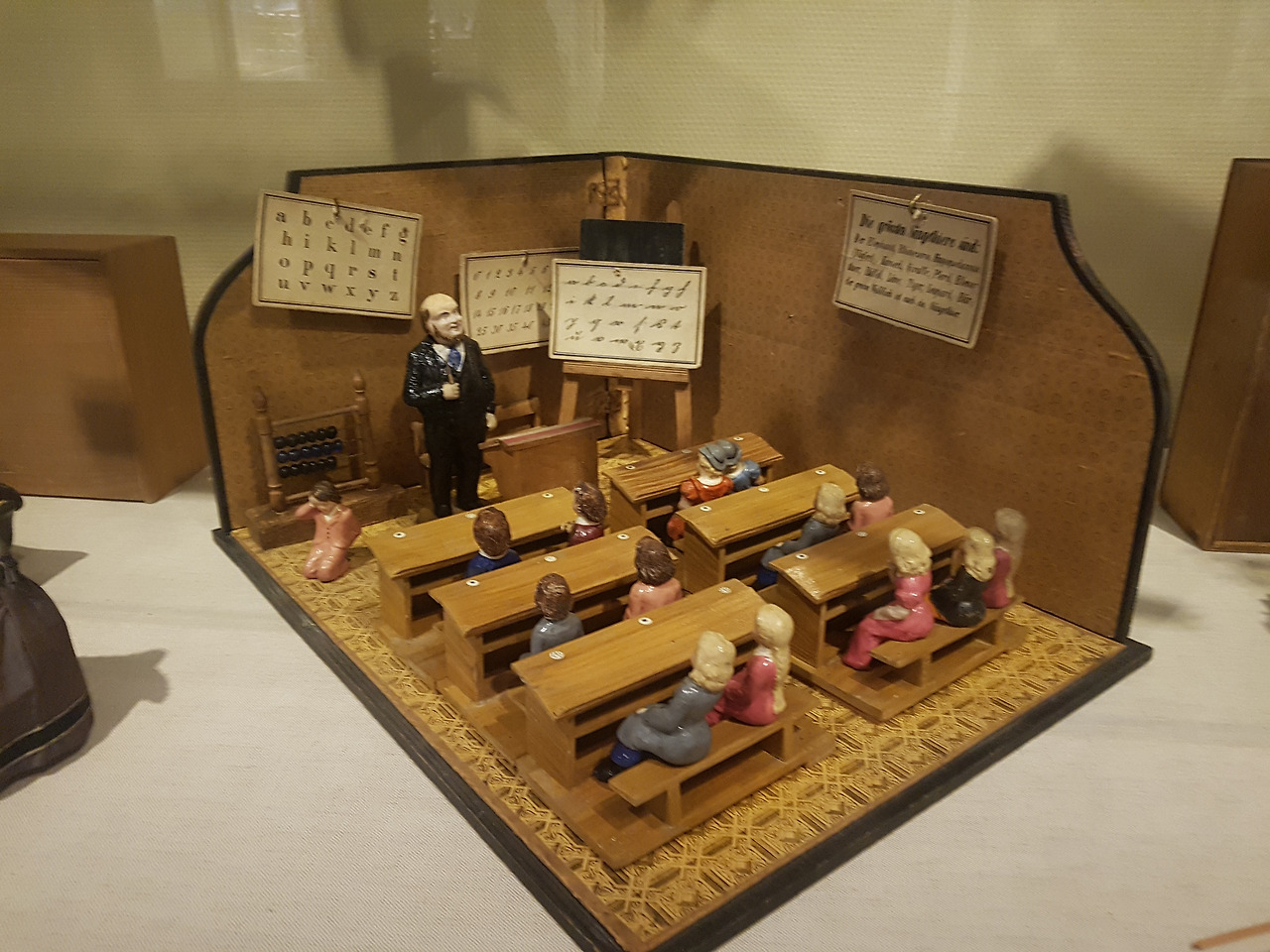 두 면이 열려 있는 작은 상자에 학교 교실의 풍경이 오밀조밀하게 꾸며져 있는 이 장난감은 디테일이 정말 재미있었다. 무언가를 잘못했는지 앞으로 나가 무릎을 꿇고 벌 받으며 우는 아이부터 모두 다른 표정과 몸짓으로 수업을 듣고 있는 학생들까지 하나하나 찬찬히 둘러볼 수밖에 없을 정도로 사랑스러웠다.