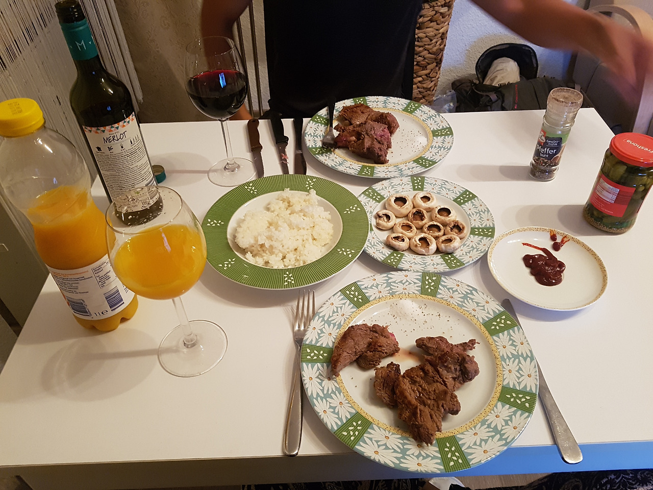 하루 종일 파워 워킹과 과호흡의 연속으로 동네 구경을 한터라 집에 돌아가자마자 비에 젖은 화장지 마냥 축 쳐져 버렸다. 우리는 지쳤을 땐 역시 고기라며 어제 마트에서 사온 스테이크를 구웠다. 그리고 남편은 와인 나는 오렌지 주스를 곁들여 간단하고 알찬 저녁 식사를 마쳤다.