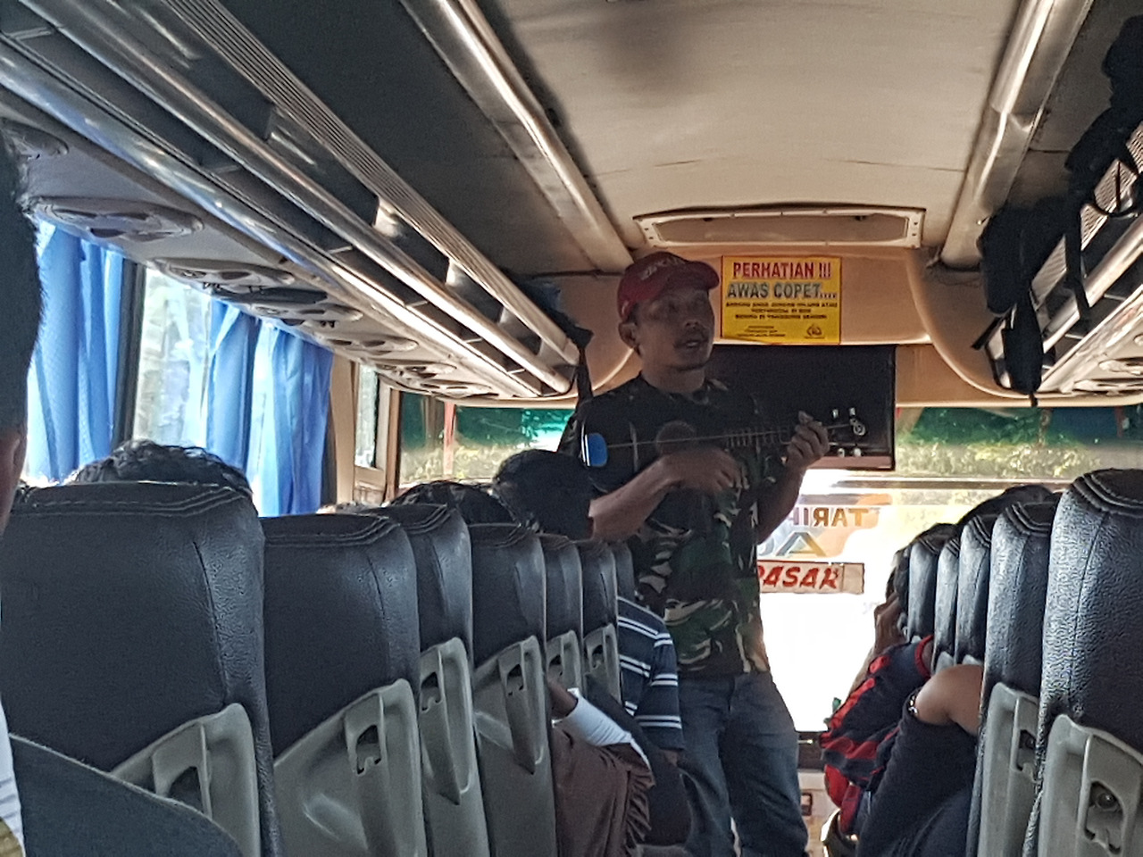 그리고 셋째, 노래하는 방랑 청년을 만났다. 그는 버스 앞쪽에서 멋들어지게 미니 기타를 치며 노래 한 곡을 뽑고, 중간쯤으로 이동해 한 곡을 더 뽑았다. 그리고 라면봉지로 만든 봉투에 돈을 걷으러 다녔다. 분위기가 우리도 넣어야 할 것 같아서, 동전 300루피를 꺼냈는데 그는 우리에게 다가오며 돈 봉지를 주머니에 넣고 악수를 청했다. 어디서 왔냐 어디에 묵냐 여러 가지를 묻더니 마침 우리가 묵을 오싱 베케이션이 좋다며 추천을 했다. 그래서 '우리 거기 예약해서 가는 거야'했더니 놀란 눈치로 오 그러냐며 거기 좋다고 엄지를 치켜세웠다. 그리고 버스 차장에게 우리를 어디서 내려줘야 하는지를 현지어로 유창하게 말하는 것 같았다. 이후 우리가 버스에서 내릴 때 따라내려 숙소까지 타고 갈 베모 잡는 것도 도와주었다. 경계했지만 그냥 좋은 동네 청년이었던 것이다. 아쉽게도 이름도 묻지 못한 채 남편과 하이파이브만 나누고 청년은 유유히 사라졌다.
